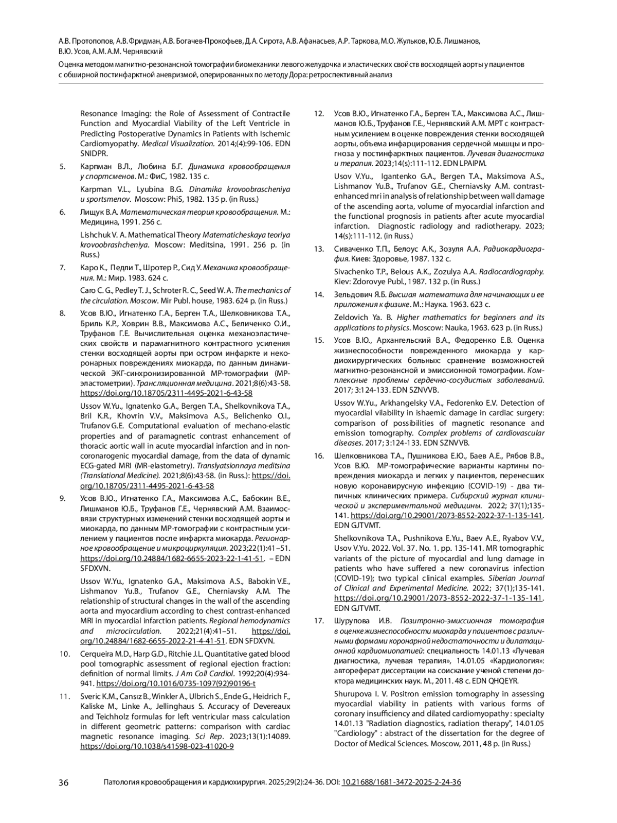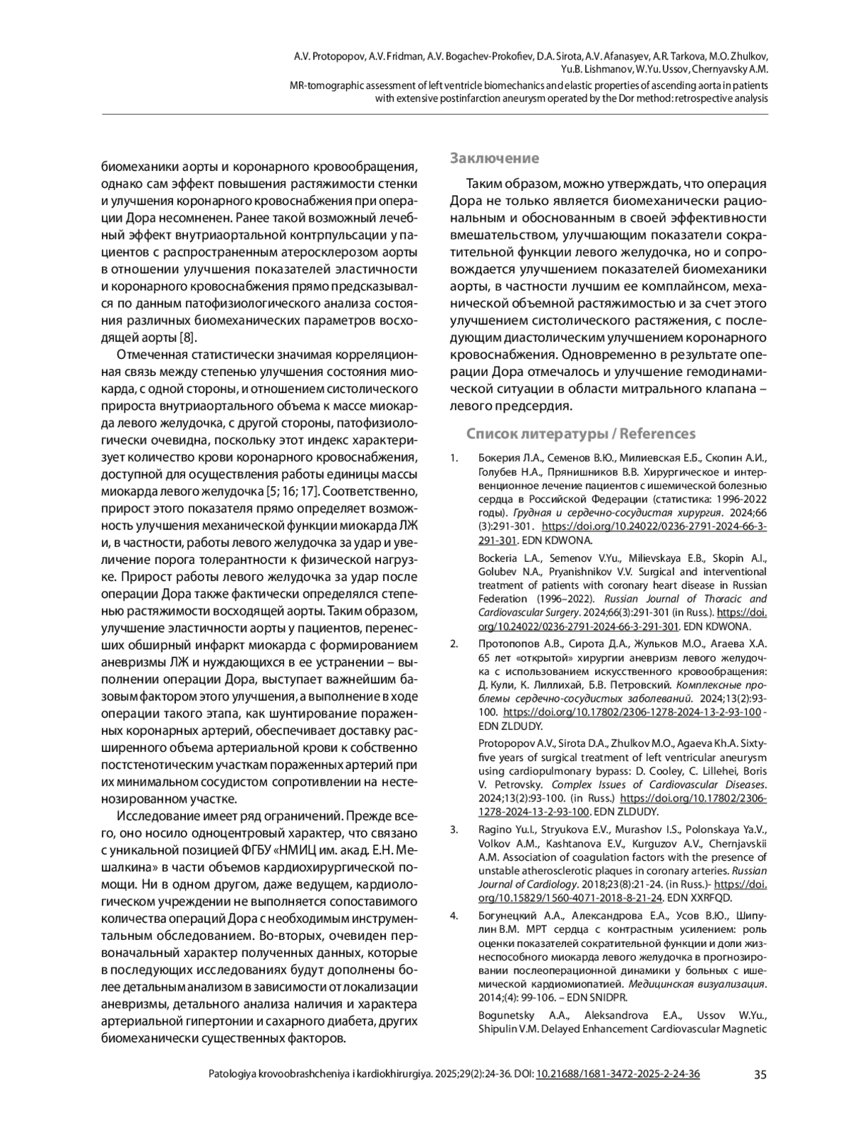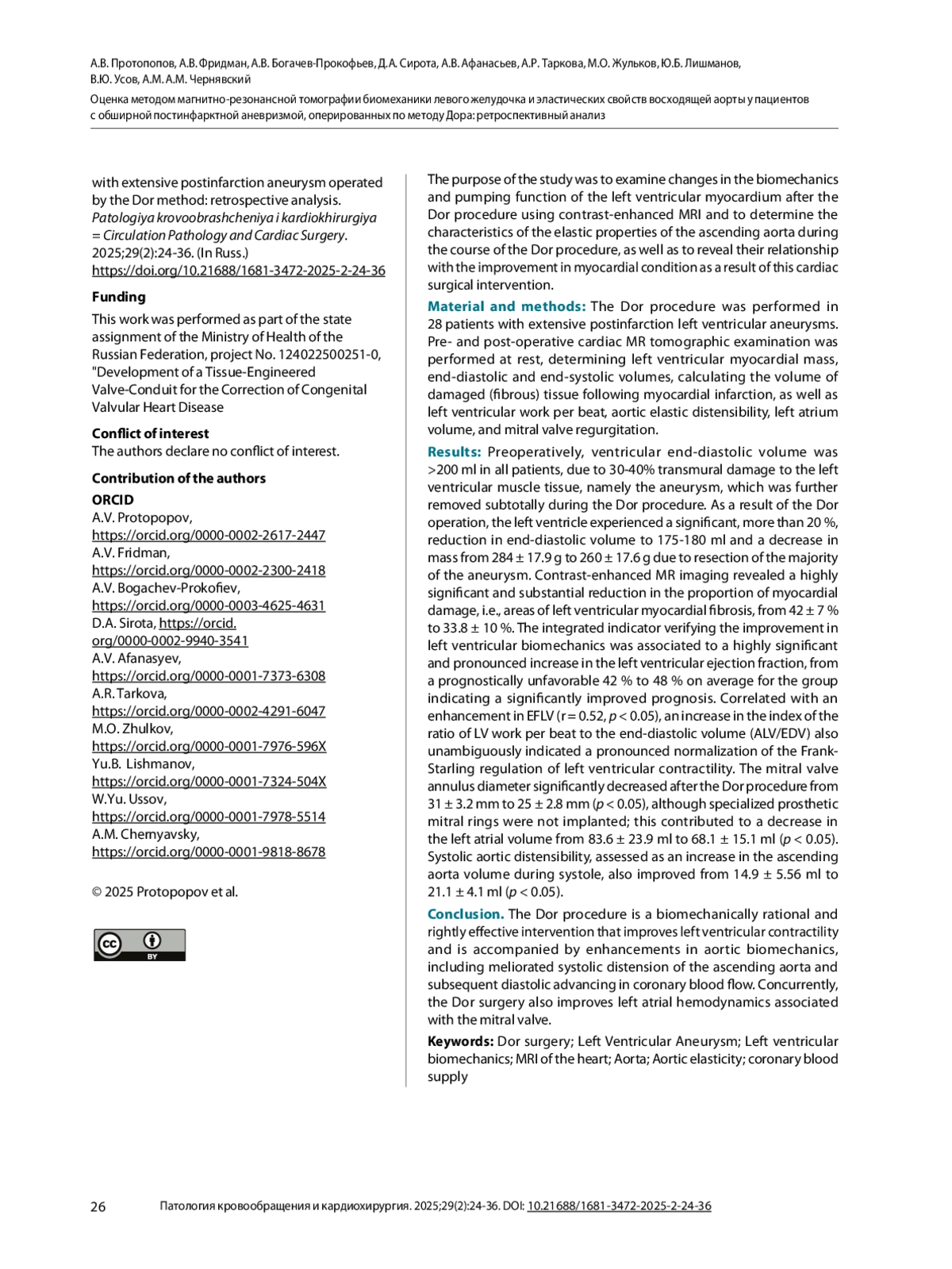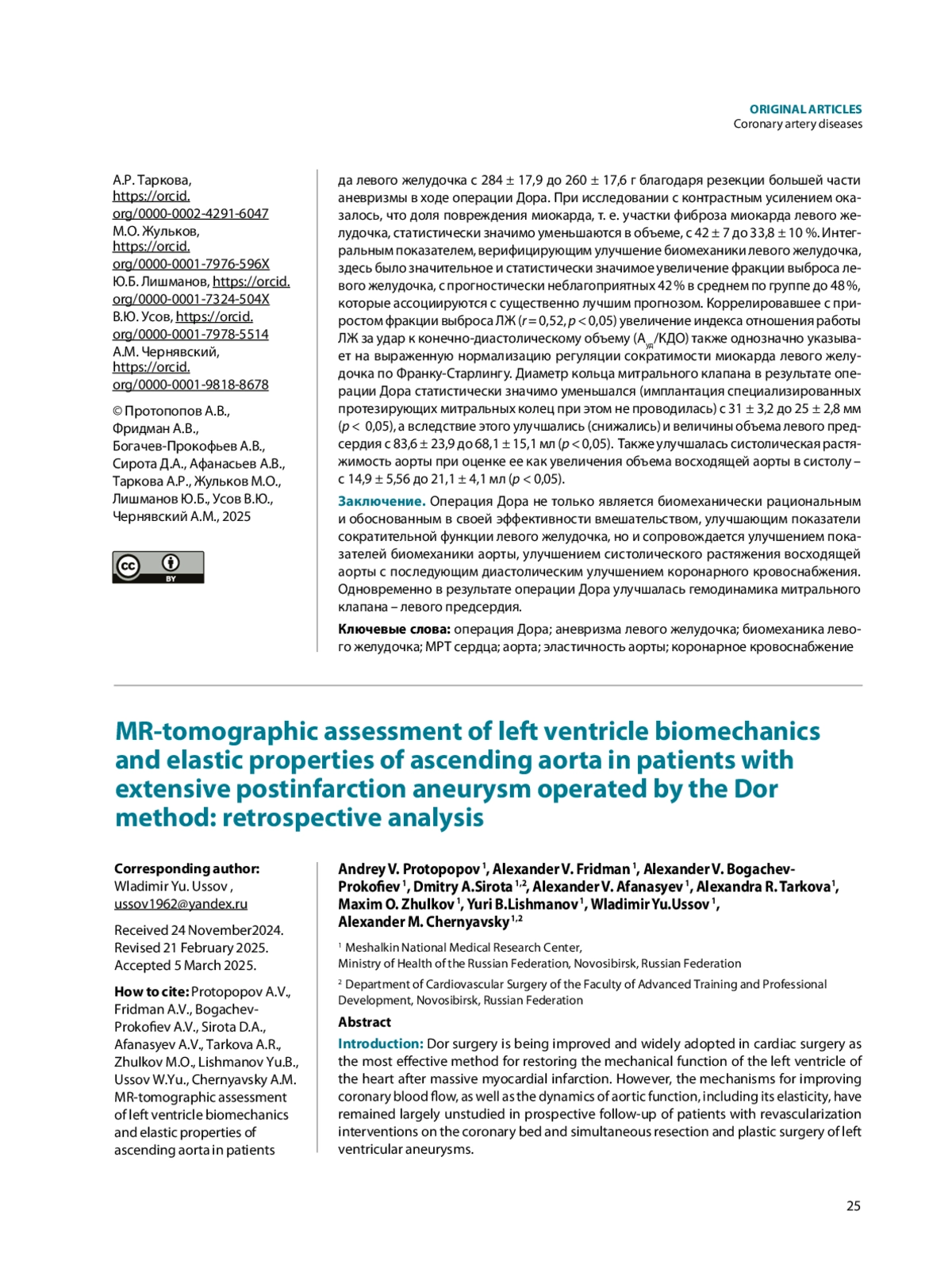 УСОВ В. Ю., ПРОТОПОПОВ А. В., ФРИДМАН А. В., БОГАЧЕВ-ПРОКОФЬЕВ А. В., СИРОТА Д.А., АФАНАСЬЕВ А. В., ТАРКОВА А.Р., ЖУЛЬКОВ М. О., ЛИШМАНОВ Ю.Б., ЧЕРНЯВСКИЙ А. М. ОЦЕНКА МЕТОДОМ МАГНИТНО-РЕЗОНАНСНОЙ ТОМОГРАФИИ БИОМЕХАНИКИ ЛЕВОГО ЖЕЛУДОЧКА И ЭЛАСТИЧЕСКИХ СВОЙСТВ ВОСХОДЯЩЕЙ АОРТЫ У ПАЦИЕНТОВ С ОБШИРНОЙ ПОСТИНФАРКТНОЙ АНЕВРИЗМОЙ, ОПЕРИРОВАННЫХ ПО МЕТОДУ ДОРА: РЕТРОСПЕКТИВНЫЙ АНАЛИЗ // ПАТОЛОГИЯ КРОВООБРАЩЕНИЯ И КАРДИОХИРУРГИЯ. 2025. № 2, ТОМ 29