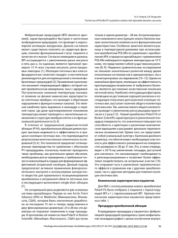 Фибрилляция предсердий (ФП) является аритмией, характеризующейся быстрым и хаотичным возбуждением предсердий, что приводит к нерегулярной активации желудочков. Данное состояние может существенно повлиять на сердечную функцию, клинико-функциональный статус пациента и качество его жизни. Согласно имеющимся данным, ФП ассоциируется с увеличением риска инсульта в пять раз и, по оценкам, является причиной примерно 15 % всех случаев инсульта, регистрируемых ежегодно [1]. Изоляция легочных вен классифицируется как «золотой стандарт» и настоятельно рекомендуется для интервенционного лечения фибрилляции предсердий [2]. Применение криоэнергии вызывает повреждающий эффект, который может проявляться как немедленно, так и с задержкой. Поступательное снижение температуры оказывает влияние на физико-химические характеристики клеточных мембран, что приводит к обратимым нарушениям в функции ионных каналов. Это явление наиболее ярко выражено в миокарде и нервной ткани, где даже кратковременное понижение температуры может приводить к значительным изменениям в структуре мембран клеток и их функциональной деятельности [3; 4].