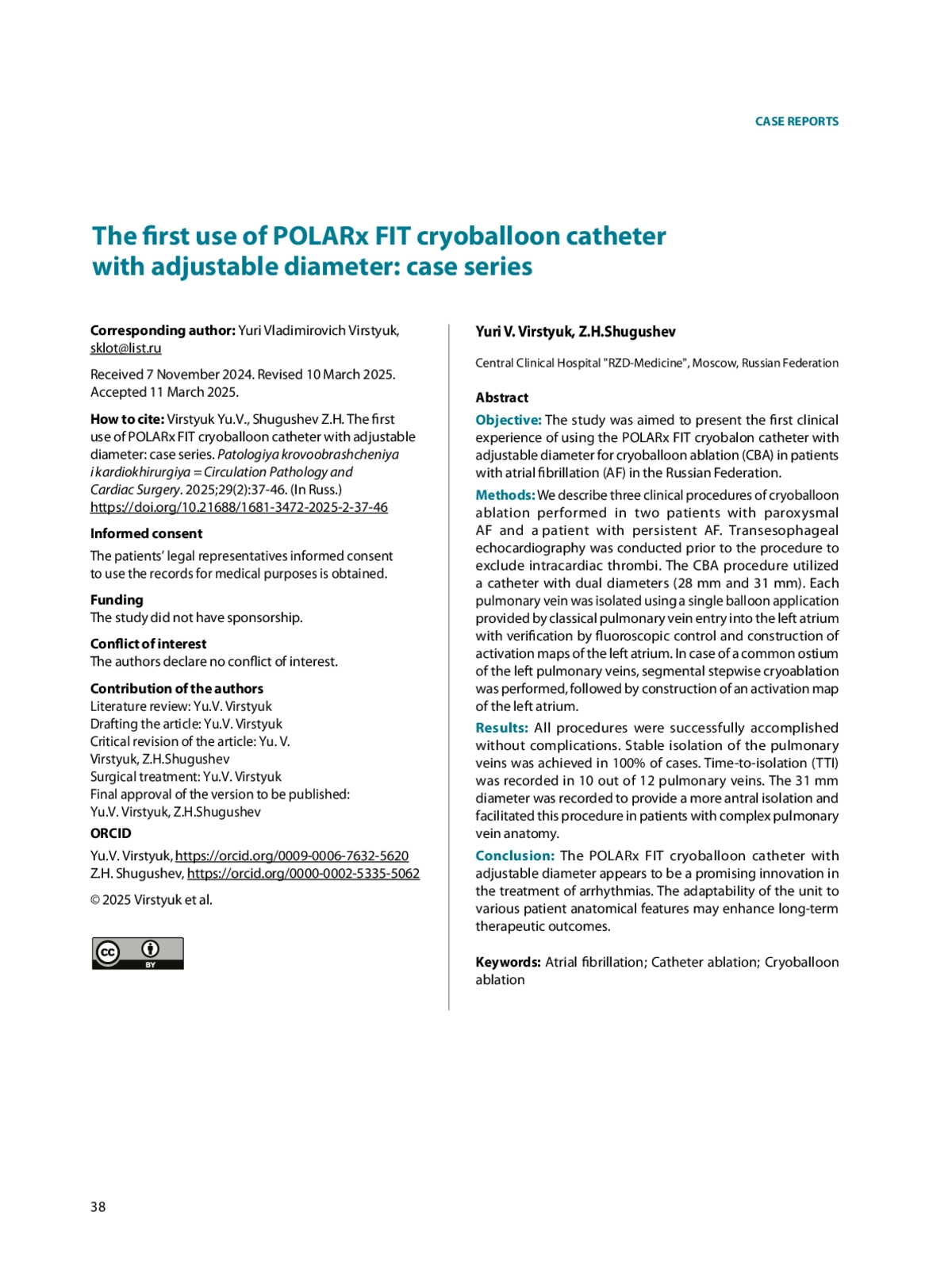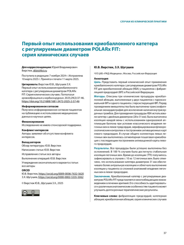 Цель. Представить первый клинический опыт применения криобаллонного катетера с регулируемым диаметром POLARx FIT для криобаллонной аблации (КБА) у пациентов с фибрилляцией предсердий (ФП) в Российской Федерации.