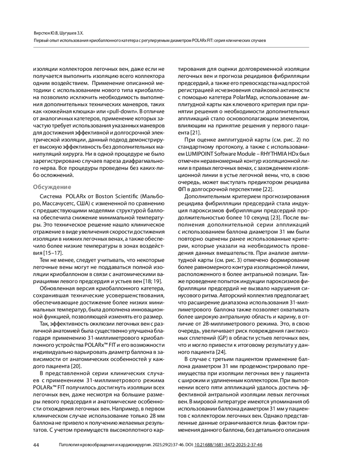Заключение. Криобаллонный катетер с регулируемым диаметром POLARx FIT представляется многообещающим нововведением в лечении аритмий. Его способность адаптироваться к различным анатомическим особенностям пациента может улучшить долгосрочные терапевтические результаты.