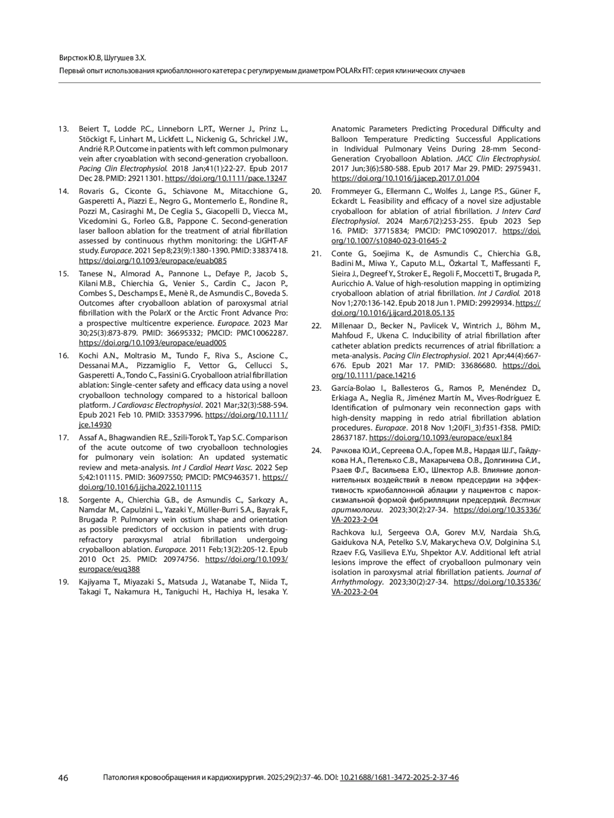 19. Kajiyama T., Miyazaki S., Matsuda J., Watanabe T., Niida T., Takagi T., Nakamura H., Taniguchi H., Hachiya H., Iesaka Y. Anatomic Parameters Predicting Procedural Difficulty and Balloon Temperature Predicting Successful Applications in Individual Pulmonary Veins During 28-mm Second-Generation Cryoballoon Ablation. JACC Clin Electrophysiol. 2017 Jun;3(6):580-588. Epub 2017 Mar 29. PMID: 29759431. DOI: 10.1016/j.jacep.2017.01.004 PMID: 29759431