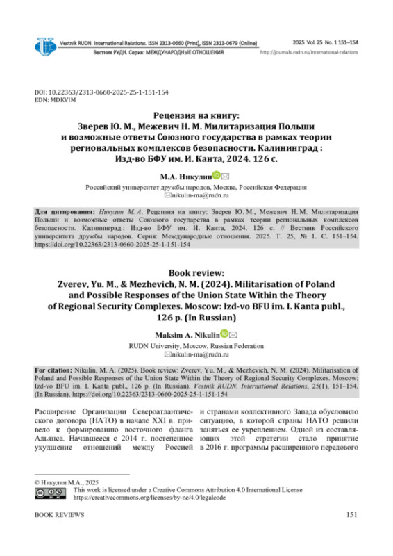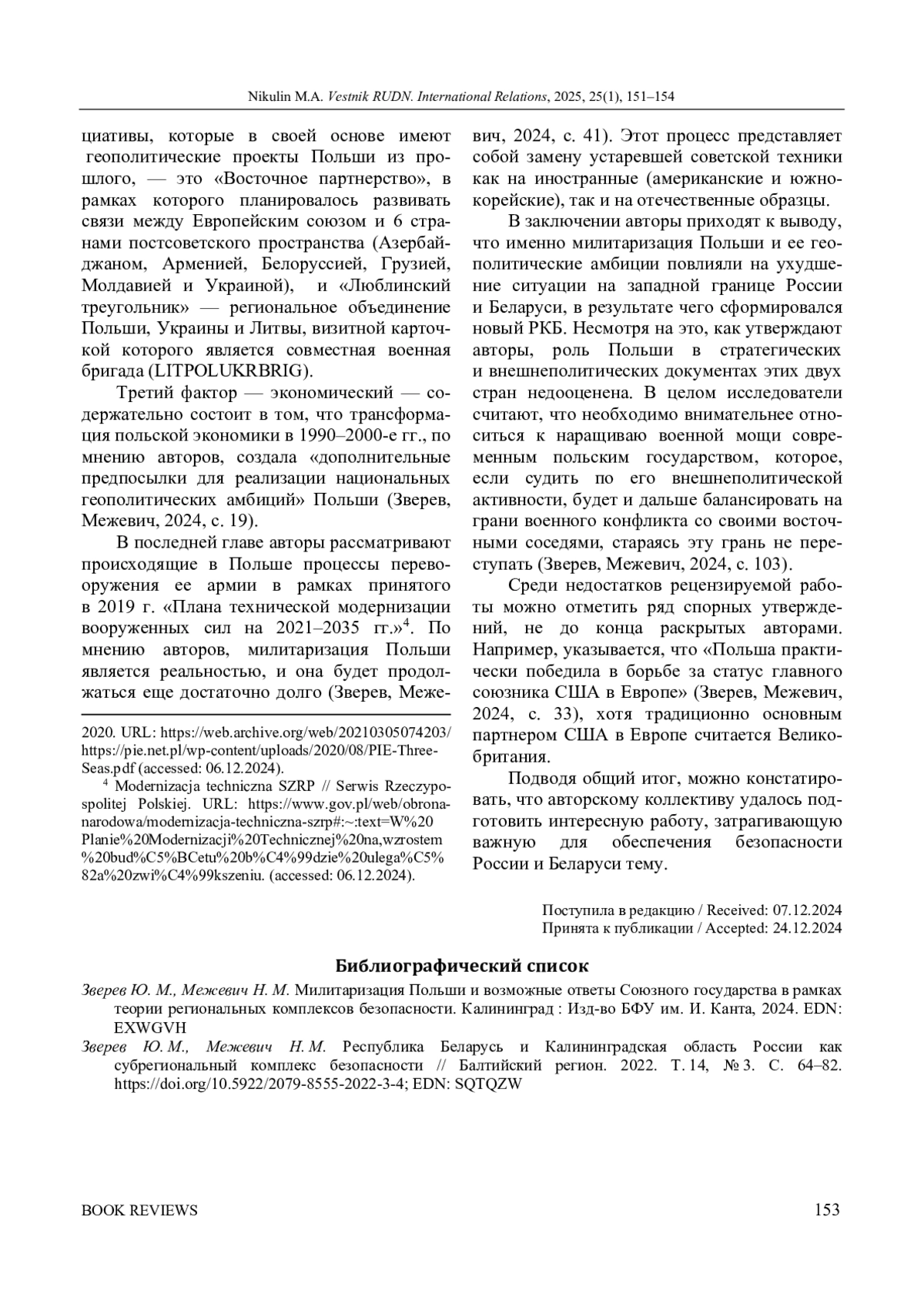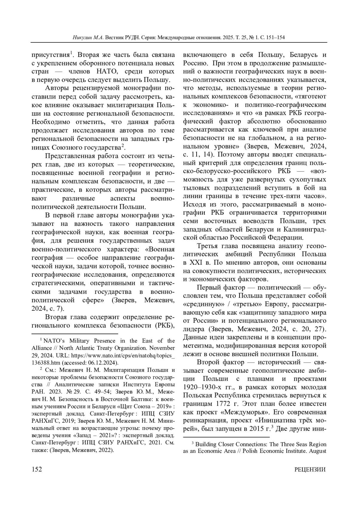 НИКУЛИН М. А. РЕЦЕНЗИЯ НА КНИГУ: ЗВЕРЕВ Ю. М., МЕЖЕВИЧ Н. М. МИЛИТАРИЗАЦИЯ ПОЛЬШИ И ВОЗМОЖНЫЕ ОТВЕТЫ СОЮЗНОГО ГОСУДАРСТВА В РАМКАХ ТЕОРИИ РЕГИОНАЛЬНЫХ КОМПЛЕКСОВ БЕЗОПАСНОСТИ. КАЛИНИНГРАД: ИЗД-ВО БФУ ИМ. И. КАНТА, 2024. 126 С. // ВЕСТНИК РОССИЙСКОГО УНИВЕРСИТЕТА ДРУЖБЫ НАРОДОВ. СЕРИЯ: МЕЖДУНАРОДНЫЕ ОТНОШЕНИЯ. 2025. ТОМ 25 № 1