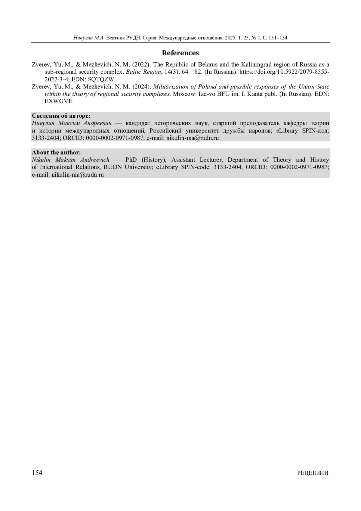 Никулин М. А. Рецензия на книгу: Зверев Ю. М., Межевич Н. М. Милитаризация Польши и возможные ответы Союзного государства в рамках теории региональных комплексов безопасности. Калининград: Изд-во БФУ им. И. Канта, 2024. 126 с. // Вестник Российского университета дружбы народов. Серия: Международные отношения. 2025. Т. 25, № 1. С. 151–154. https://doi. org/10.22363/2313-0660-2025-25-1-151-154