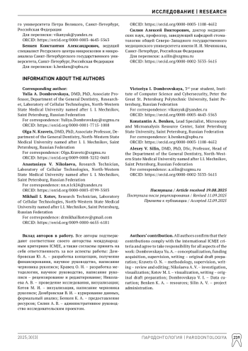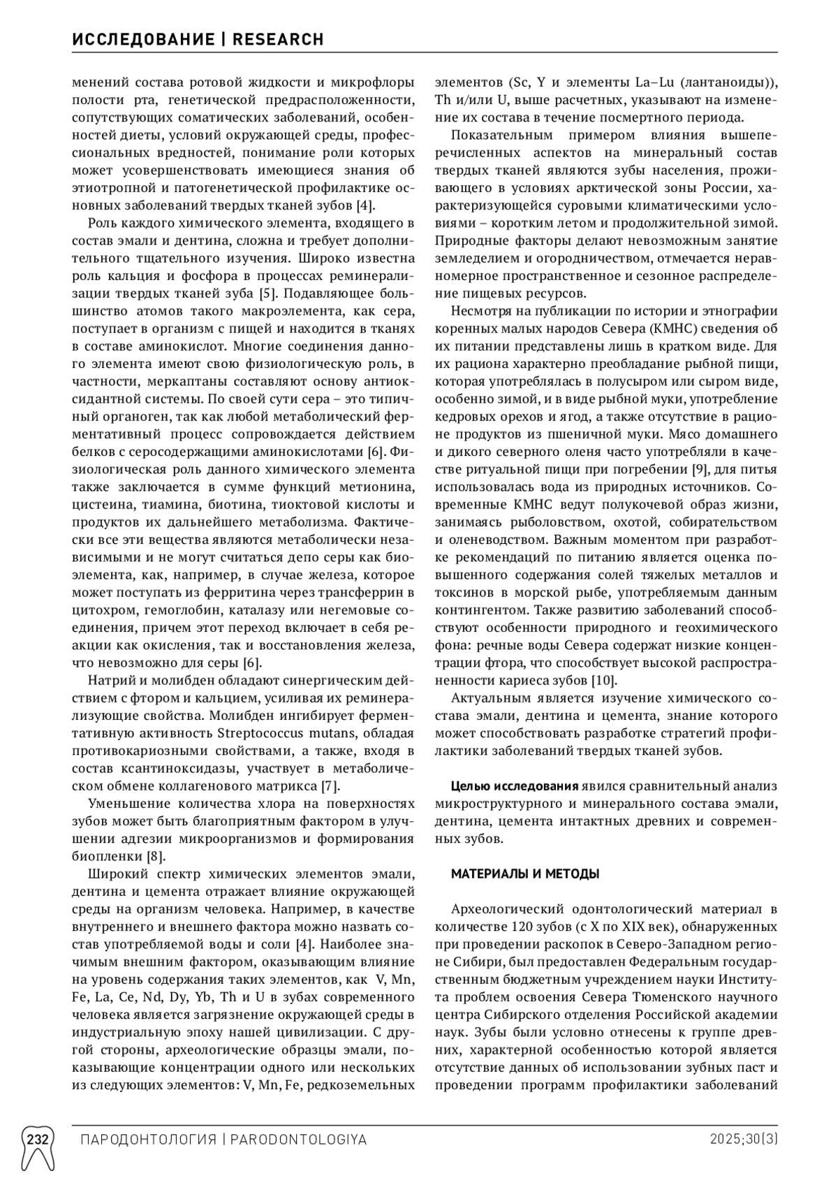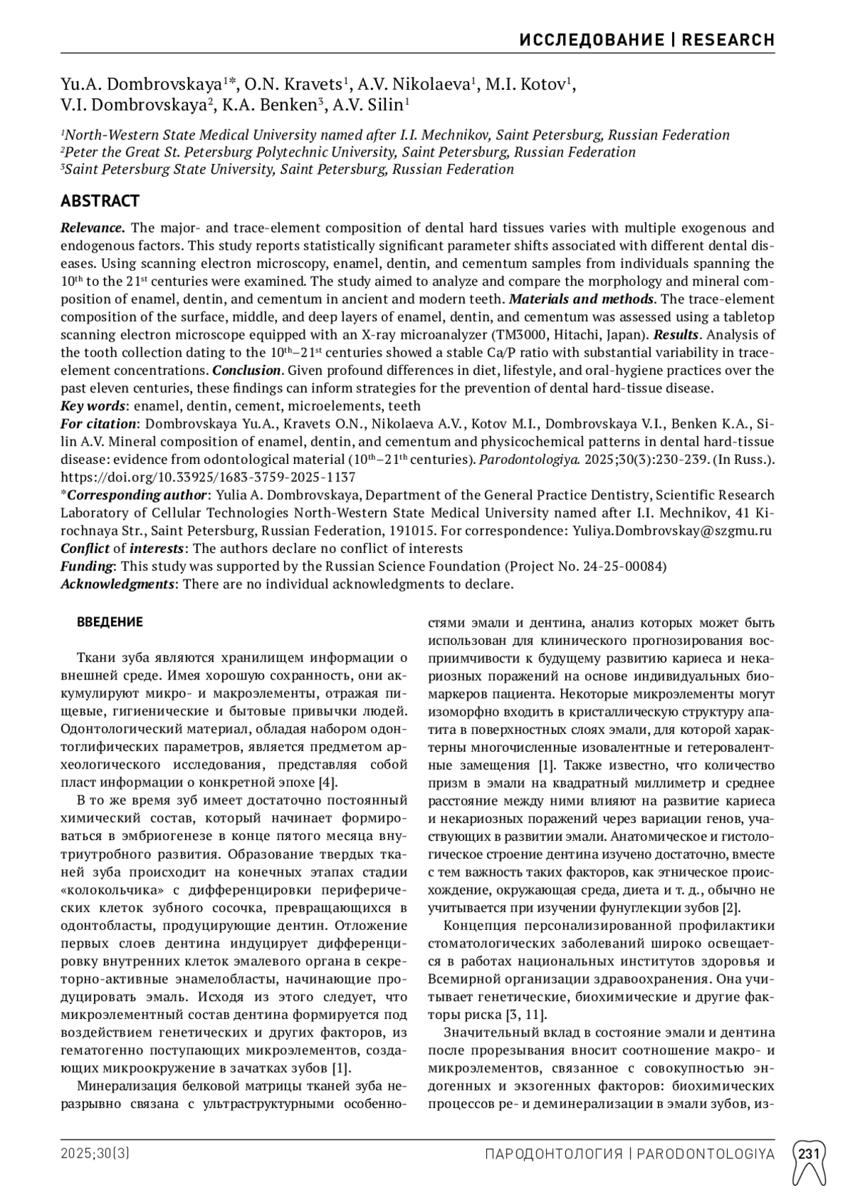 4. Домбровская ЮА, Кравец ОН, Николаева АВ, Котов МИ, Домбровская ВИ, Бенкен КА, и др. Эволюционные тенденции изменения микроэлементного состава эмали, поверхностных слоев дентина, цемента зубов человека в Северо-Западном регионе Сибири в норме и при патологии в X-XX веках. Стоматология. 2025;104(1):5-8. DOI: 10.17116/stomat20251040115