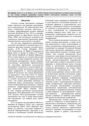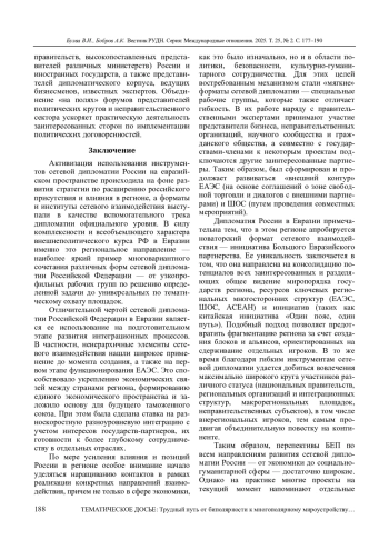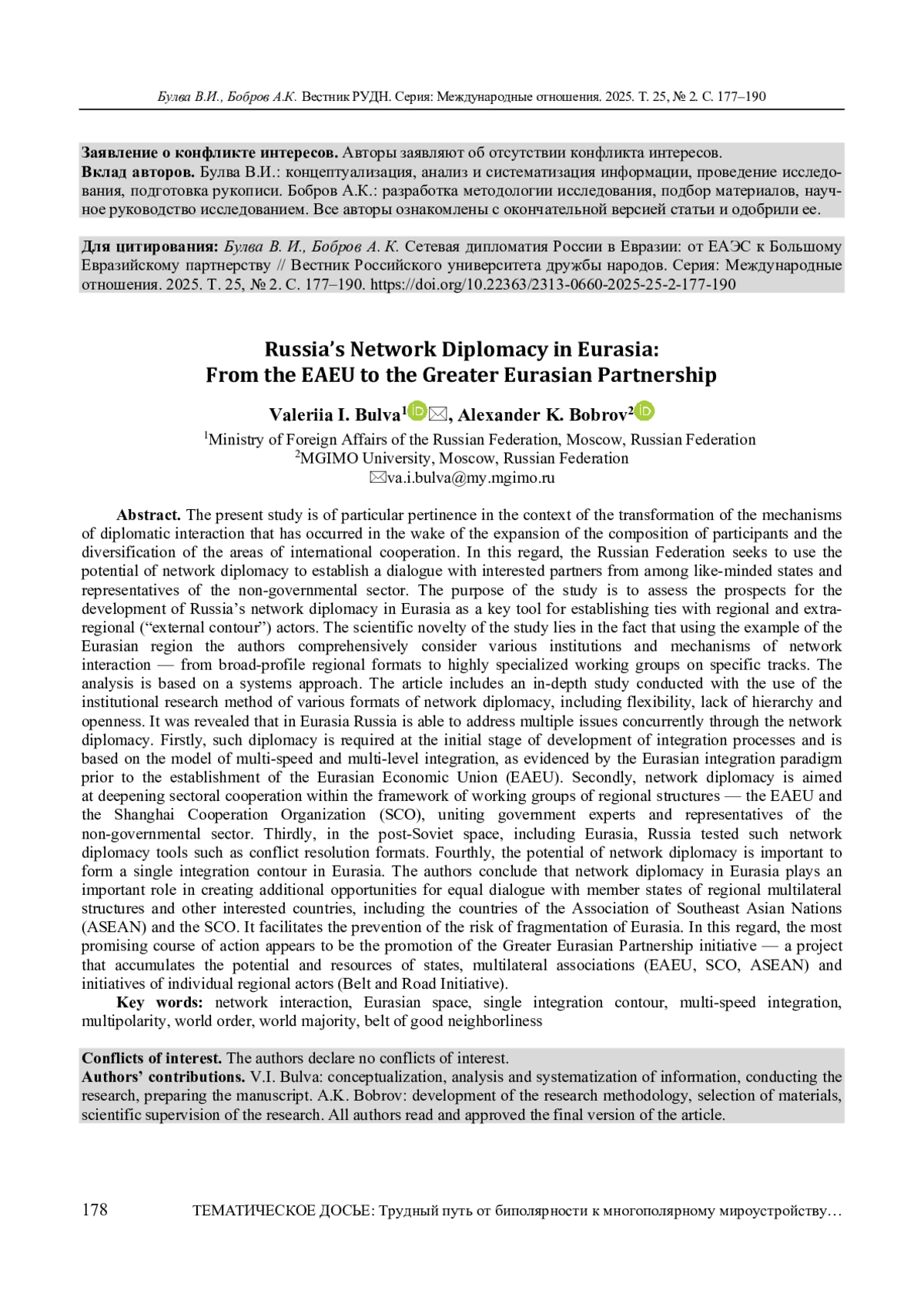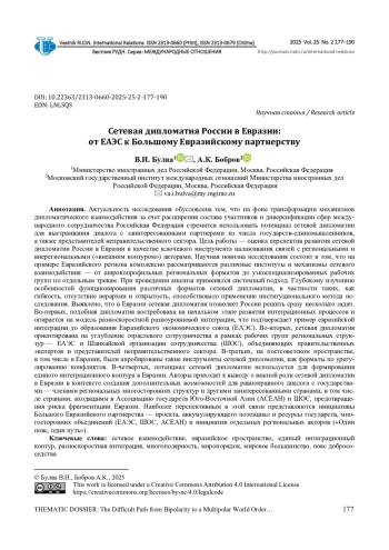 Цель работы - оценка перспектив развития сетевой дипломатии России в Евразии в качестве ключевого инструмента налаживания связей с региональными и внерегиональными («внешним контуром») акторами. Научная новизна исследования состоит в том, что на примере Евразийского региона комплексно рассматриваются различные институты и механизмы сетевого взаимодействия - от широкопрофильных региональных форматов до узкоспециализированных рабочих групп по отдельным трекам. При проведении анализа применялся системный подход. Глубокому изучению особенностей функционирования различных форматов сетевой дипломатии, в частности таких, как гибкость, отсутствие иерархии и открытость, способствовало применение институционального метода исследования. Выявлено, что в Евразии сетевая дипломатия позволяет России решить сразу несколько задач. Во-первых, подобная дипломатия востребована на начальном этапе развития интеграционных процессов и опирается на модель разноскоростной разноуровневой интеграции, что подтверждает пример евразийской интеграции до образования Евразийского экономического союза (ЕАЭС). Во-вторых, сетевая дипломатия ориентирована на углубление отраслевого сотрудничества в рамках рабочих групп региональных структур - ЕАЭС и Шанхайской организации сотрудничества (ШОС), объединяющих правительственных экспертов и представителей неправительственного сектора. В-третьих, на постсоветском пространстве, в том числе в Евразии, были апробированы такие инструменты сетевой дипломатии, как форматы по урегулированию конфликтов. В-четвертых, потенциал сетевой дипломатии используется для формирования единого интеграционного контура в Евразии. Авторы приходят к выводу о важной роли сетевой дипломатии в Евразии в контексте создания дополнительных возможностей для равноправного диалога с государствами - членами региональных многосторонних структур и другими заинтересованными странами, в том числе странами, входящими в Ассоциацию государств Юго-Восточной Азии (АСЕАН) и ШОС, предотвращения риска фрагментации Евразии. Наиболее перспективным в этой связи представляются инициативы Большого Евразийского партнерства - проекта, аккумулирующего потенциал и ресурсы государств, многосторонних объединений (ЕАЭС, ШОС, АСЕАН) и инициатив отдельных региональных акторов («Один пояс, один путь»).