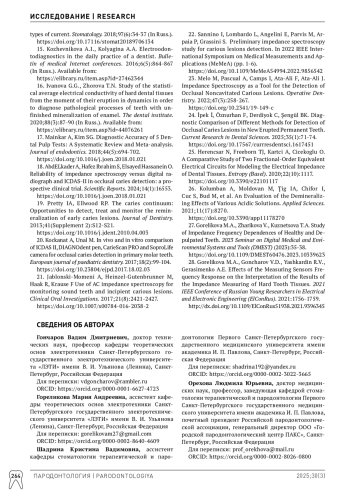 27. Gorelikova MA, Zharikova V, Kuznetsova TA. Study of Impedance Frequency Dependences of Healthy and Depulpated Teeth. 2023 Seminar on Digital Medical and Environmental Systems and Tools (DMEST) (2023):35-38. DOI: 10.1109/DMEST60476.2023.10339623