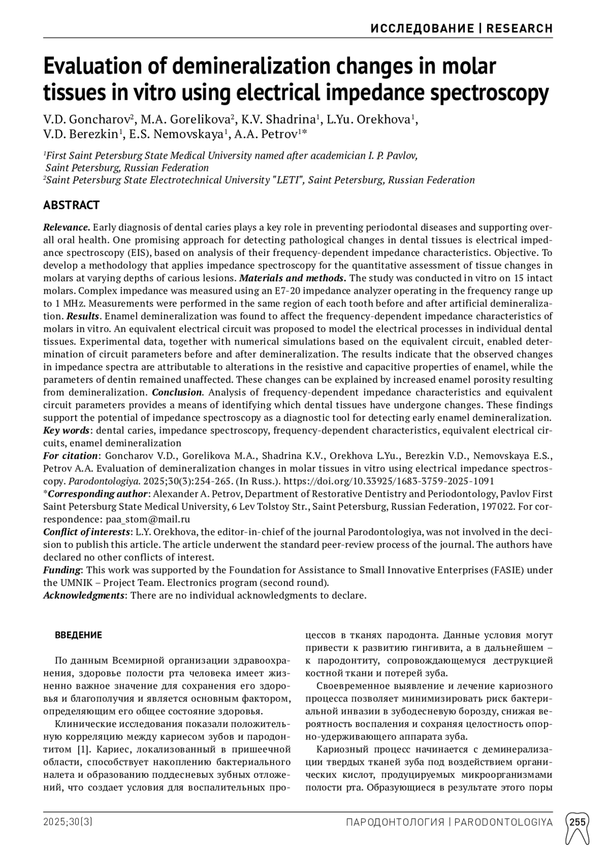 28. Gorelikova MA, Goncharov VD, Yashkardin RV, Gerasimenko AE. Effects of the Measuring Sensors Frequency Response on the Interpretation of the Results of the Impedance Measuring of Hard Tooth Tissues. 2021 IEEE Conference of Russian Young Researchers in Electrical and Electronic Engineering (ElConRus). 2021:1756-1759.