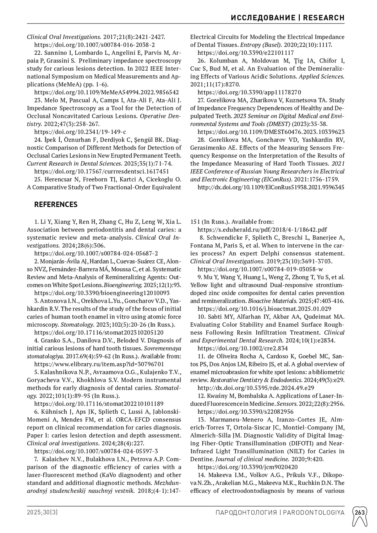 16. Иванова ГГ, Жорова ТН. Исследование среднестатистического показателя электропроводности твердых тканей зубов с момента их прорезывания в динамике с целью диагностики патологических процессов зубов с незаконченной минерализацией эмали. Институт стоматологии. 2020;88(3):87-90. Режим доступа: item.asp?id=44076261.