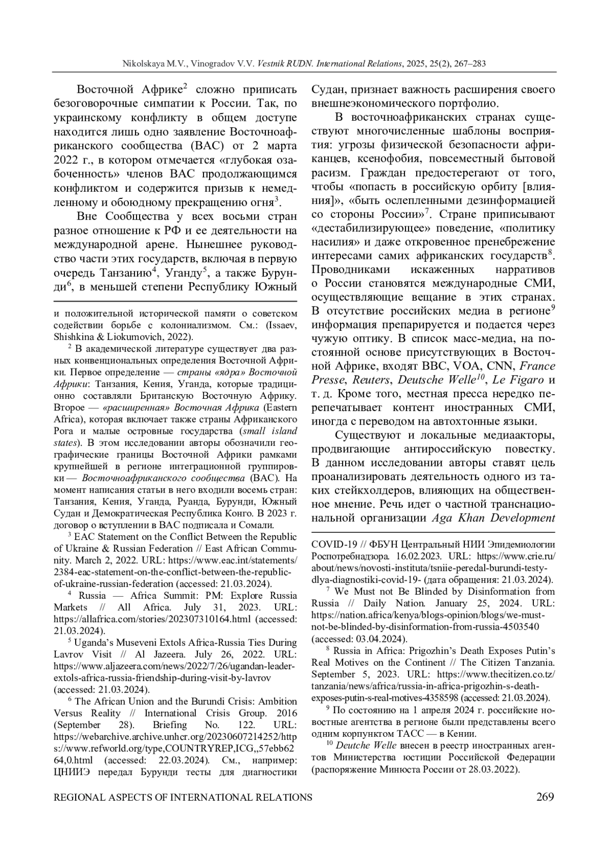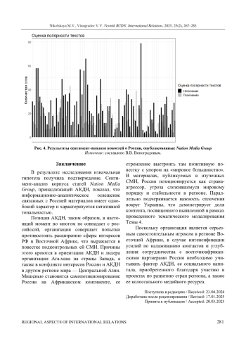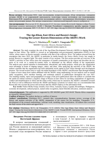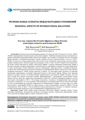 Исследуется роль Организации развития Ага-хана ( Aga Khan Development Network, AKDN, АКДН) в формировании имиджа России в Восточной Африке. АКДН рассматривается как независимая неправительственная организация (НПО) в Восточной Африке, чья позиция в отношении России в настоящее время совпадает с позицией коллективного Запада. Авторы исходят из предположения о том, что с 2022 г. АКДН, в частности ее медиаподразделение Nation Media Group, направляет значительные усилия на формирование отрицательного имиджа России. Исследование состоит из двух частей. В первой части представлены обзор сетевой деятельности АКДН в Восточной Африке с момента появления исмаилитских общин в регионе и описаны основные направления этой деятельности с разбивкой по странам на основе официального сайта организации. Особое внимание уделено гуманитарным, образовательным и медийным проектам, которые дают организации больше рычагов влияния для формирования образов, ценностей и идей. Проанализировав деятельность АКДН, авторы приходят к выводу, что благодаря таким проектам по развитию организация сформировала солидный социальный капитал в Восточной Африке. Вторая часть призвана доказать исходную гипотезу об антироссийской направленности деятельности АКДН в регионе, для чего была создана база данных новостных изданий, аффилированных с организацией, использованы методы анализа текстов, такие как определение именованных сущностей, латентное размещение Дирихле и сентимент-анализ публикаций за 2023 г. Полученная тональность, тематики и географический охват новостей позволяют подтвердить, что исследованные СМИ формируют негативный образ России в Восточной Африке через ассоциативный ряд агрессии, конфликтов и дестабилизации в Африке и во всем мире, что может быть связано с ориентацией АКДН на страны Запада, а также несовпадением интересов АКДН и России в Центральной Азии. В связи с этим российской стороне рекомендуется учитывать то влияние и ресурсы, которые организация задействует в восточноафриканском информационном поле.