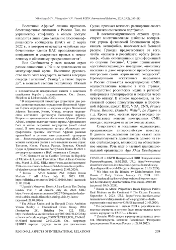 19. Issaev L., Shishkina A., Liokumovich Y. Perceptions of Russia’s ‘Return’ to Africa: Views from West Africa // South African Journal of International Affairs. 2022. Vol. 29, iss. 4. P. 425-444. ;. DOI: 10.1080/10220461.2022.2139289 EDN: VGXTKC
