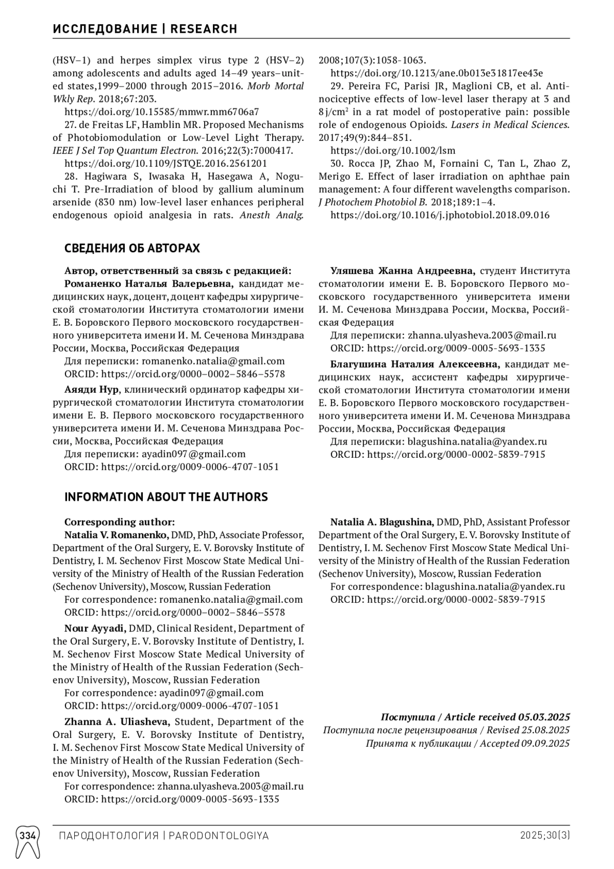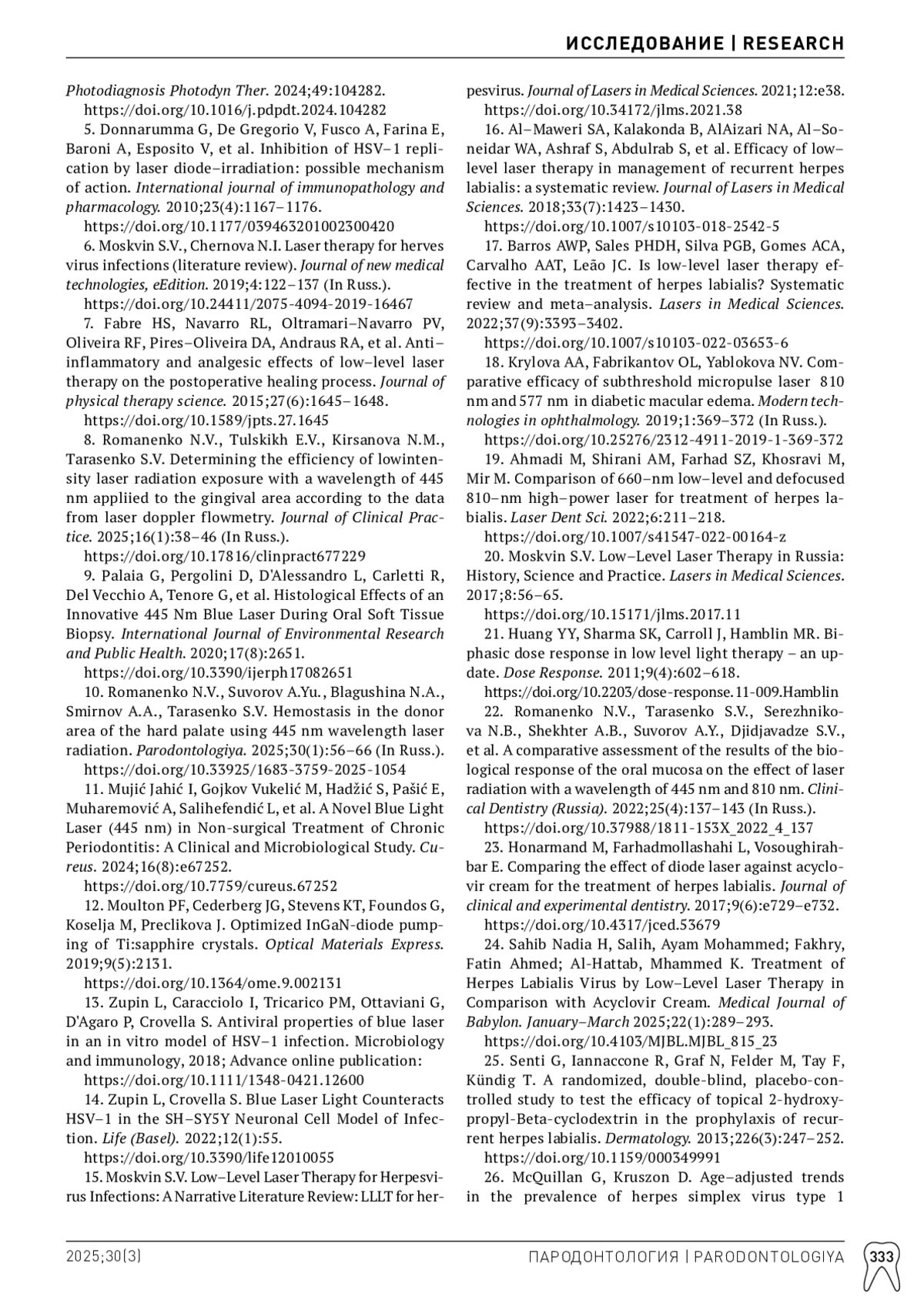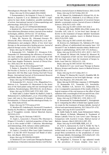 8. Романенко НВ, Тульских ЕВ, Кирсанова НМ, Тарасенко СВ. Определение эффективности воздействия низкоинтенсивным лазерным излучением длиной волны 445 нм на область десны по данным лазерной допплеровской флоуметрии. Клиническая практика. 2025;16(1):38-46. DOI: 10.17816/clinpract677229