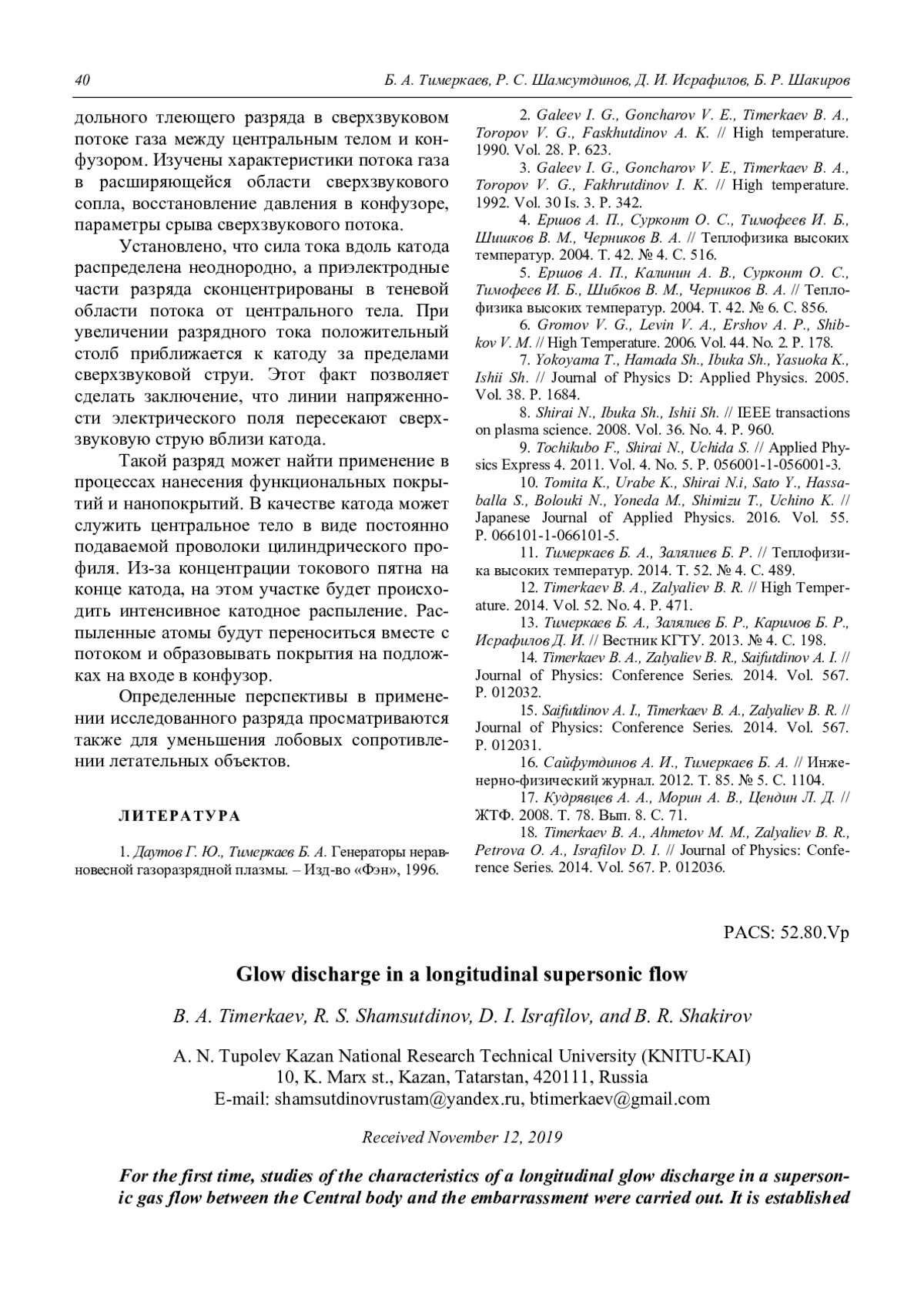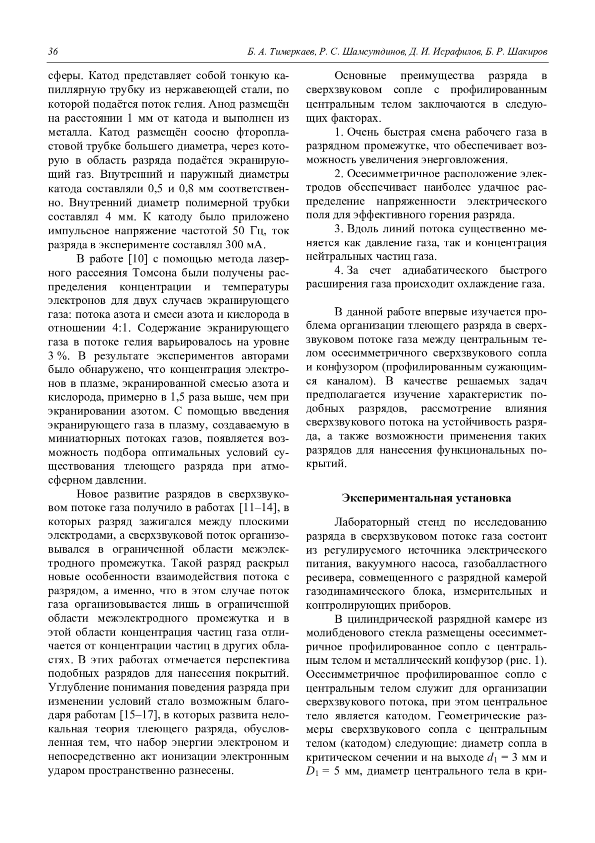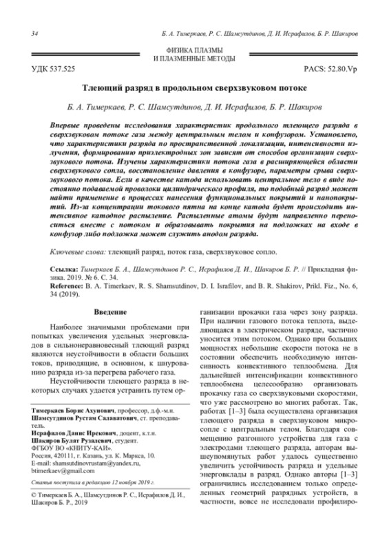 Тимеркаев Б. А., Шамсутдинов Р. С., Исрафилов Д. И., Шакиров Б. Р. Тлеющий разряд в продольном сверхзвуковом потоке 34