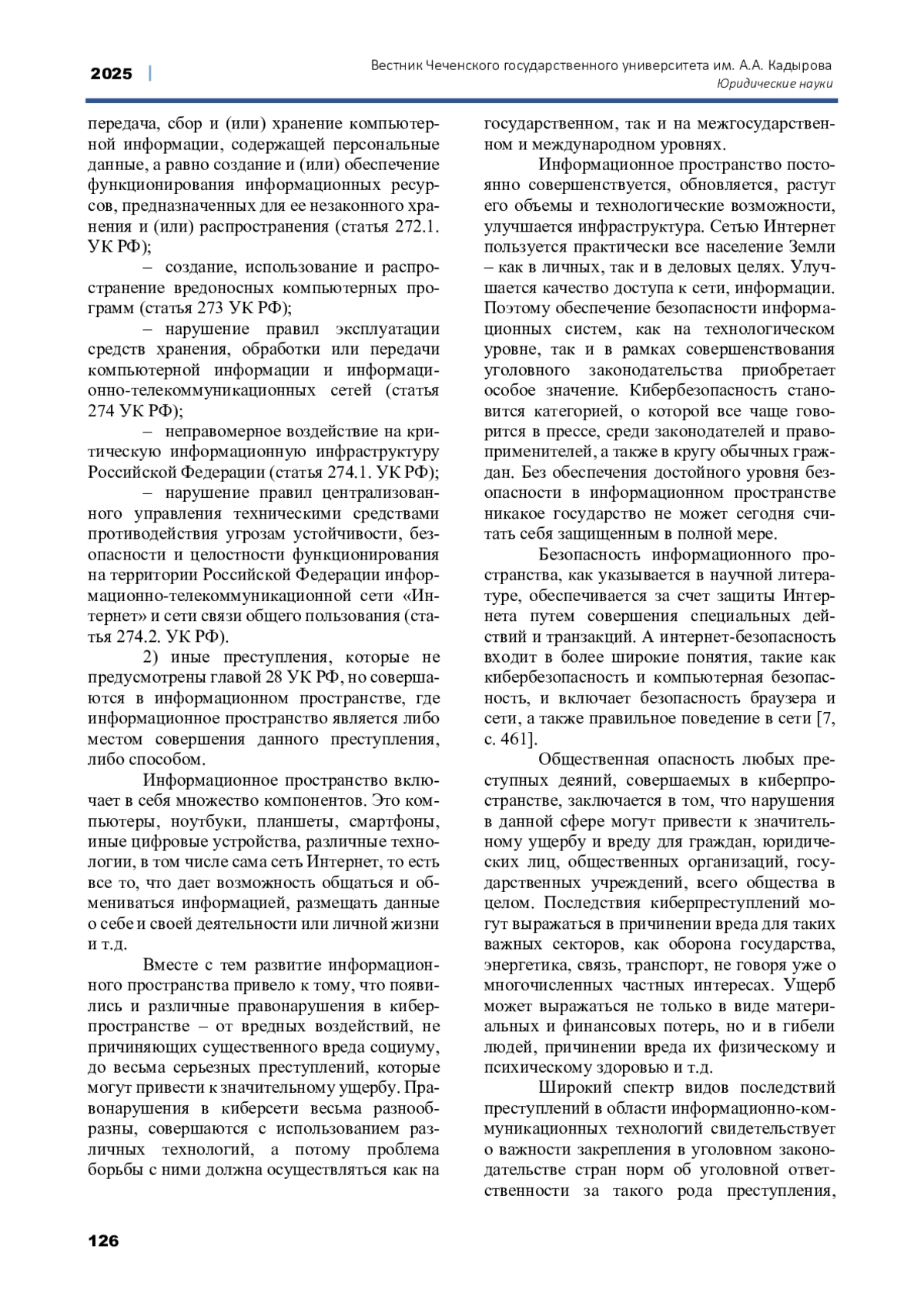 7. Назаренко И.С., Меняйло Д.В., Федосеев А.Э., Самойлова Ю.М. Угрозы безопасности в киберпространстве и способы защиты от них // Право и государство: теория и практика. 2024. № 7(235). - С. 461-465. EDN: FEGQAW