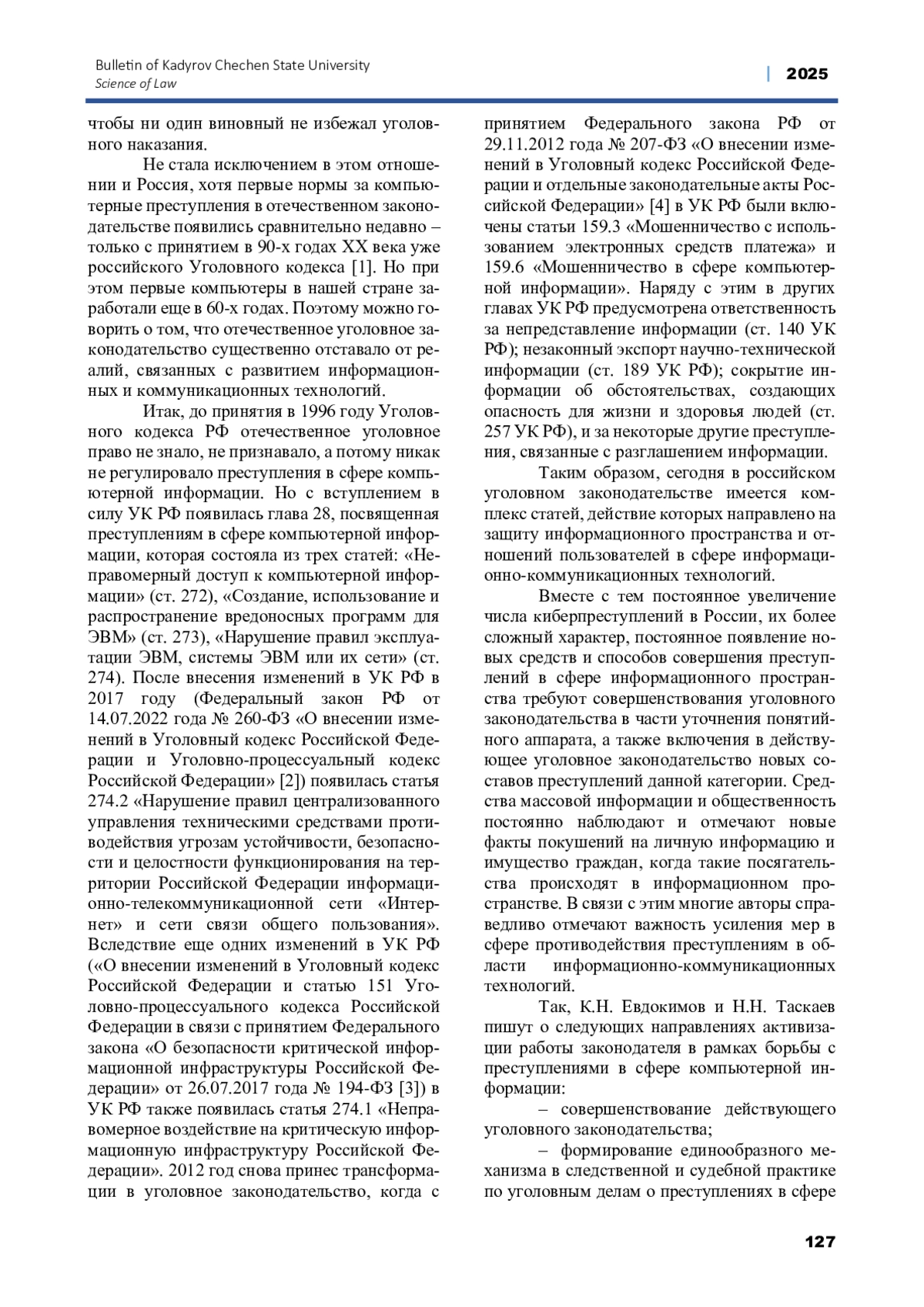 6. Евдокимов К.Н., Таскаев Н.Н. Актуальные вопросы обеспечения информационной безопасности российской федерации: уголовно-правовые и криминологические аспекты // Обеспечение национальной безопасности России в современном мире: материалы международной научно-практической конференции, Иркутск, 26-27 мая 2016 года / Министерство образования и науки РФ; Байкальский государственный университет. - Иркутск: Байкальский государственный университет, 2016. - С. 66-74. EDN: WNMPKH