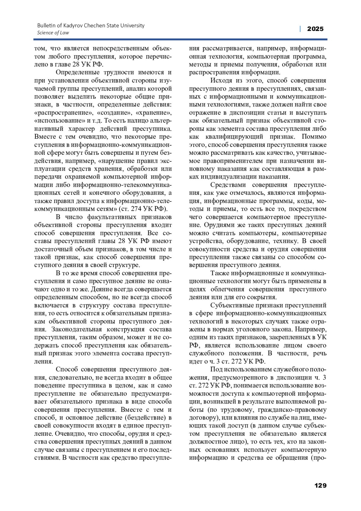 уникационным сетям» (ст. 274 УК РФ). В число факультативных признаков объективной стороны преступления входит способ совершения преступления. Все составы преступлений главы 28 УК РФ имеют достаточный объем признаков, в том числе и такой признак, как способ совершения преступного деяния в своей структуре. В то же время способ совершения преступления и само преступное деяние не означают одно и то же. Деяние всегда совершается определенным способом, но не всегда способ включается в структуру состава преступления, то есть относится к обязательным признакам объективной стороны преступного деяния. Законодательная конструкция состава преступления, таким образом, может и не содержать способ преступления как обязательный признак этого элемента состава преступления.