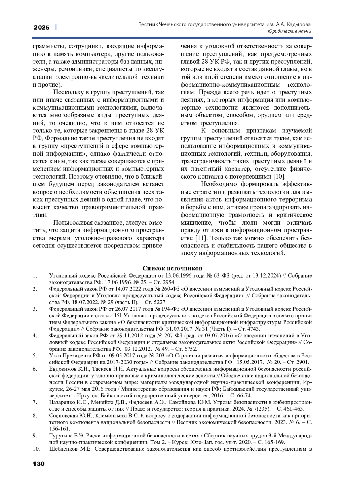10. Щебленков М.Е. Совершенствование законодательства как способ противодействия преступлениям в сфере компьютерной информации // В сборнике: Уголовное право: вопросы теории и практики. Сборник докладов Всероссийского студенческого научно-практического круглого стола с международным участием. Под редакцией Е.Н. Рахмановой, Е.А. Писаревской, М.А. Дворжицкой. - Санкт-Петербург, 2023. - С. 150-153. EDN: ZWIPIT