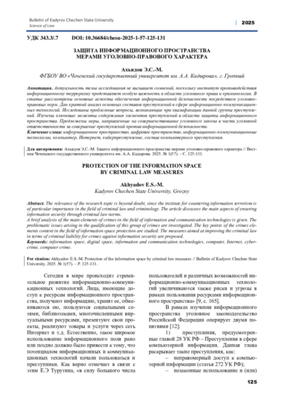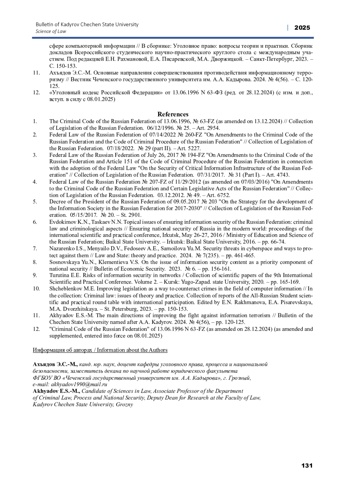 11. Ахъядов Э.С.-М. Основные направления совершенствования противодействия информационному терроризму // Вестник Чеченского государственного университета им. А.А. Кадырова. 2024. № 4(56). - С. 120-125. EDN: FPNLII