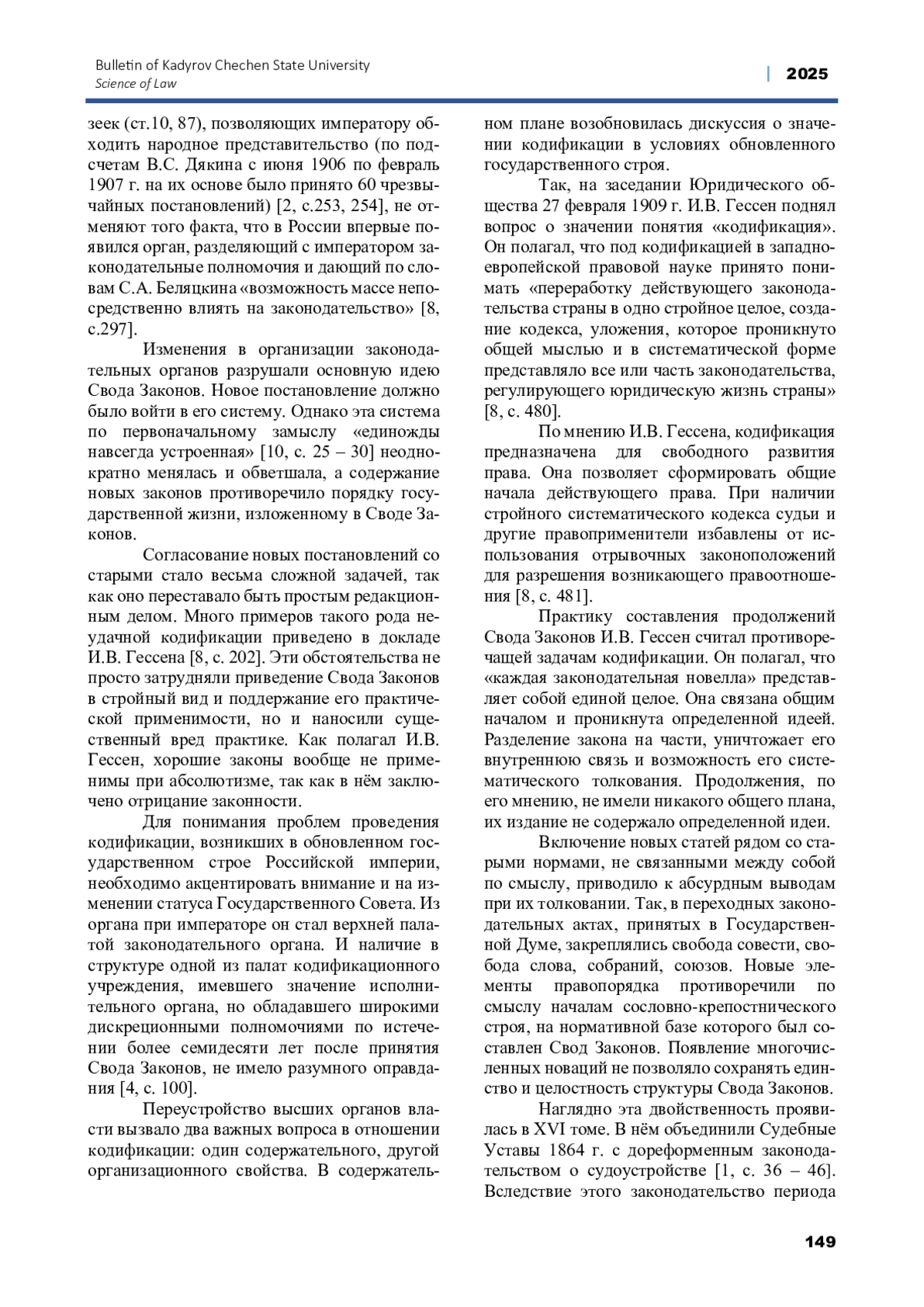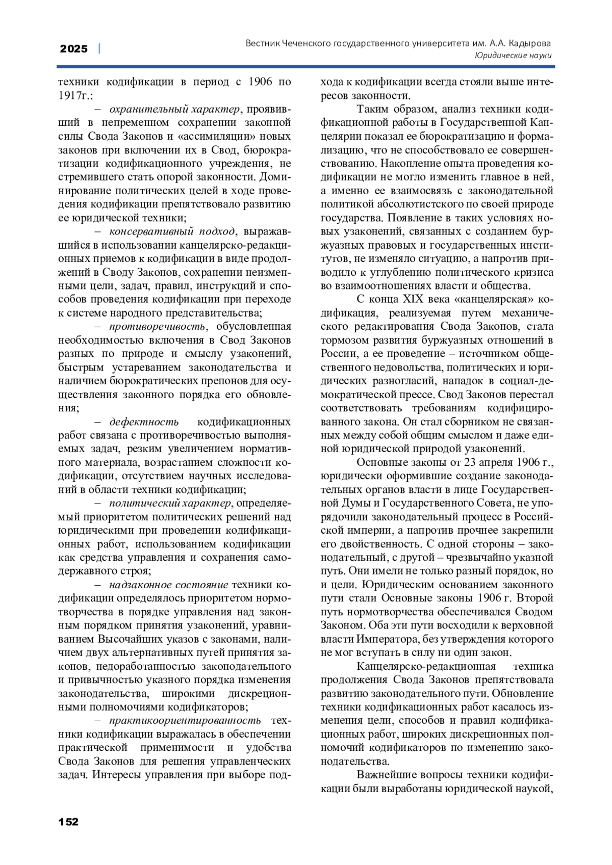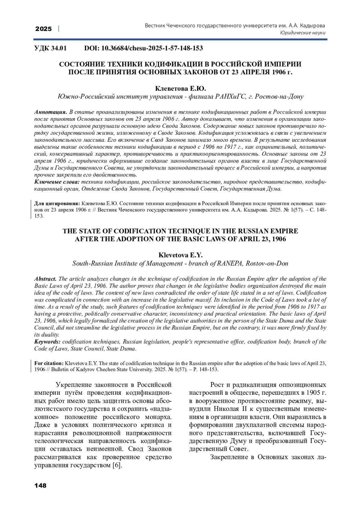 КЛЕВЕТОВА Е.Ю. СОСТОЯНИЕ ТЕХНИКИ КОДИФИКАЦИИ В РОССИЙСКОЙ ИМПЕРИИ ПОСЛЕ ПРИНЯТИЯ ОСНОВНЫХ ЗАКОНОВ ОТ 23 АПРЕЛЯ 1906 Г // ВЕСТНИК ЧЕЧЕНСКОГО ГОСУДАРСТВЕННОГО УНИВЕРСИТЕТА ИМ. А. А. КАДЫРОВА. 2025. № 1 (57)