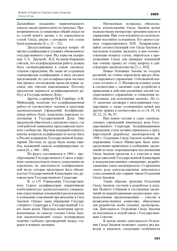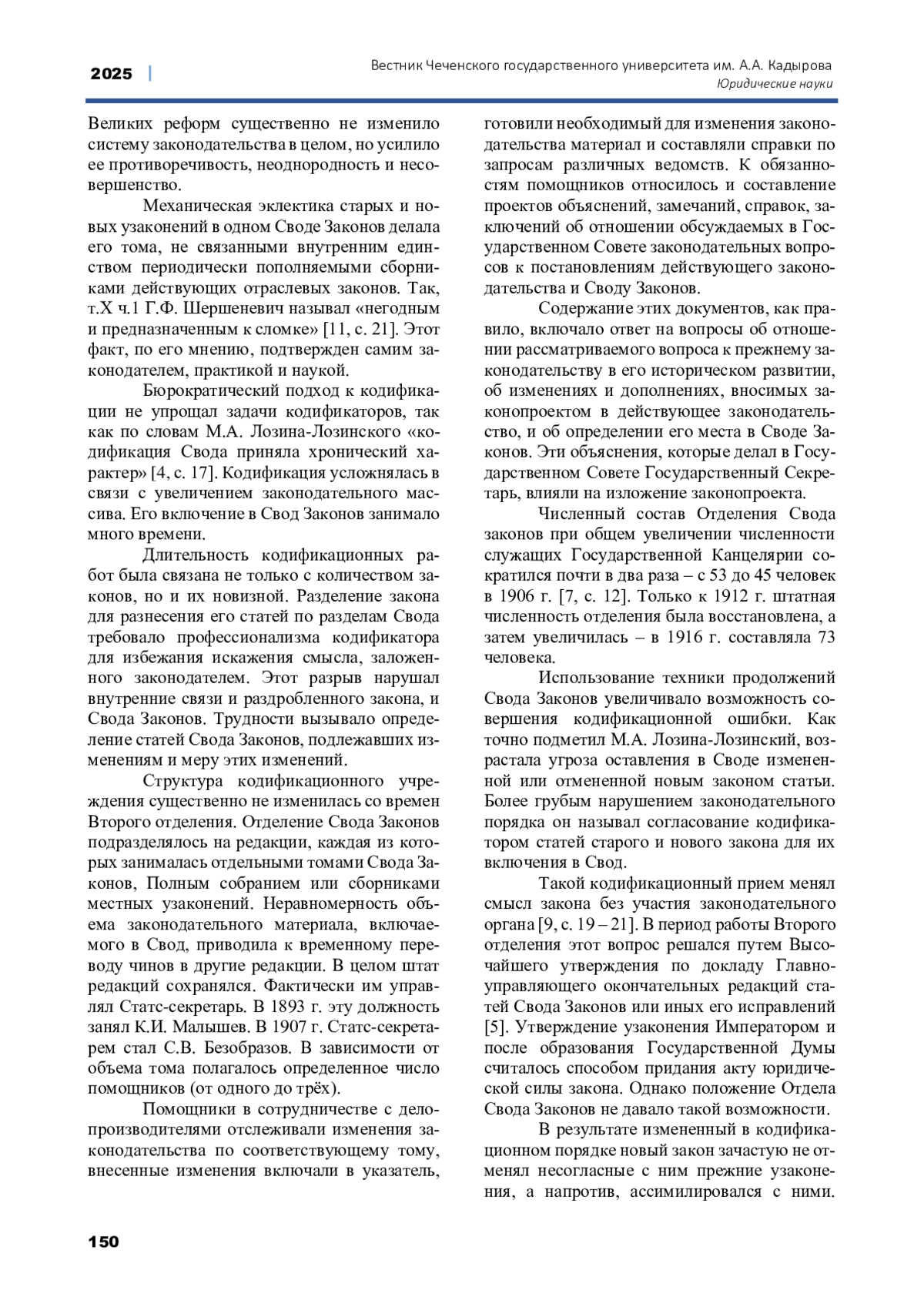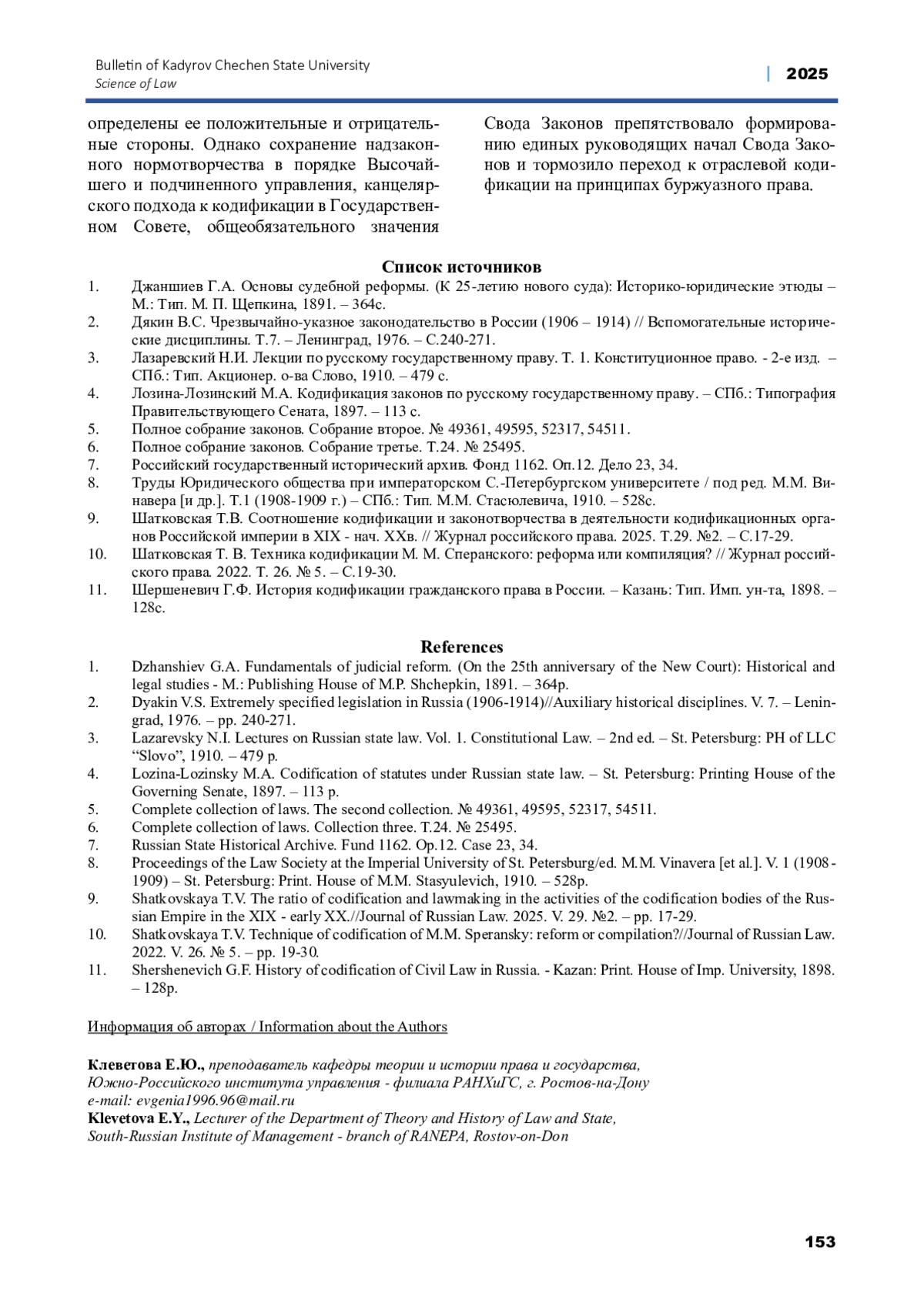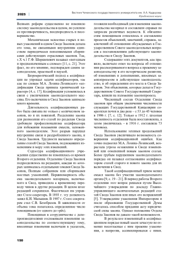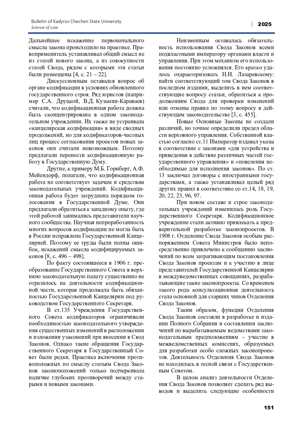 КЛЕВЕТОВА Е.Ю. СОСТОЯНИЕ ТЕХНИКИ КОДИФИКАЦИИ В РОССИЙСКОЙ ИМПЕРИИ ПОСЛЕ ПРИНЯТИЯ ОСНОВНЫХ ЗАКОНОВ ОТ 23 АПРЕЛЯ 1906 Г // ВЕСТНИК ЧЕЧЕНСКОГО ГОСУДАРСТВЕННОГО УНИВЕРСИТЕТА ИМ. А. А. КАДЫРОВА. 2025. № 1 (57)