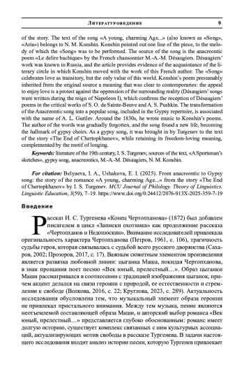 В рассказе И. С. Тургенева «Конец Чертопханова» важным сюжетным элементом является развязка любовной линии: цыганка Маша, покидая Чертопханова, в знак прощания поет песню «Век юный, прелестный…». Авторский выбор романса представляется глубоко обоснованным: романс имеет долгую историю, существует комплекс связанных с ним ассоциаций, актуализирующих мотив свободы в рассказе Тургенева. Анализ истории песни, которую Тургенев привлекает в качестве цыганского романса, позволяет уточнить ее роль в структуре рассказа. Текст романса «Век юный, прелестный…» (также известен под названиями «Песня», «Ария») принадлежит Н. М. Коншину. Он указал одну строку произведения, на мелодию которого должна была исполняться «Песня». Источником песни является анакреонтическое стихотворение «Le delire bachique» французского шансонье М.-А.-М. Дезожье. Творчество Дезожье было известно в России: в статье приводятся доказательства знакомства литературного круга, в котором вращался Коншин, с творчеством этого французского автора. В «Песне» воспевается любовь как преходящая, но единственная ценность этого мира. Стихотворение Коншина предположительно унаследовало от первоисточника смысл, который был ясен современникам: в призыве наслаждаться любовью звучит протест против гнета окружающей действительности (песни Дезожье писались во время правления Наполеона I), что подтверждает рецепция творчества Дезожье в критических работах Ш. О. де Сент-Бева и А. С. Пушкина. Превращение анакреонтической песни в популярный романс, вошедший в цыганский репертуар, связано с именем А. Л. Гурилева. Приблизительно в 1830-е гг. он написал музыку к стихам Коншина. Автор слов постепенно был забыт, а романс обрел новую жизнь, став визитной карточкой цыганских хоров. В качестве цыганской песни он и был привлечен Тургеневым в текст рассказа «Конец Чертопханова», сохранив при этом свой вольнолюбивый смысл, дополненный мотивом тоски.