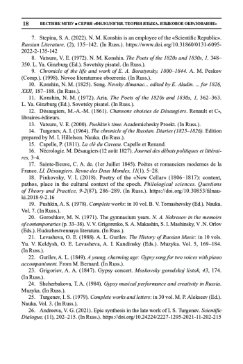 7. Степина, С. А. (2022). Н. М. Коншин - сотрудник “Ученой республики”. Русская литература, (2), 135-142. https://www. DOI: 10.31860/0131-6095-2022-2-135-142 EDN: WSIUCA