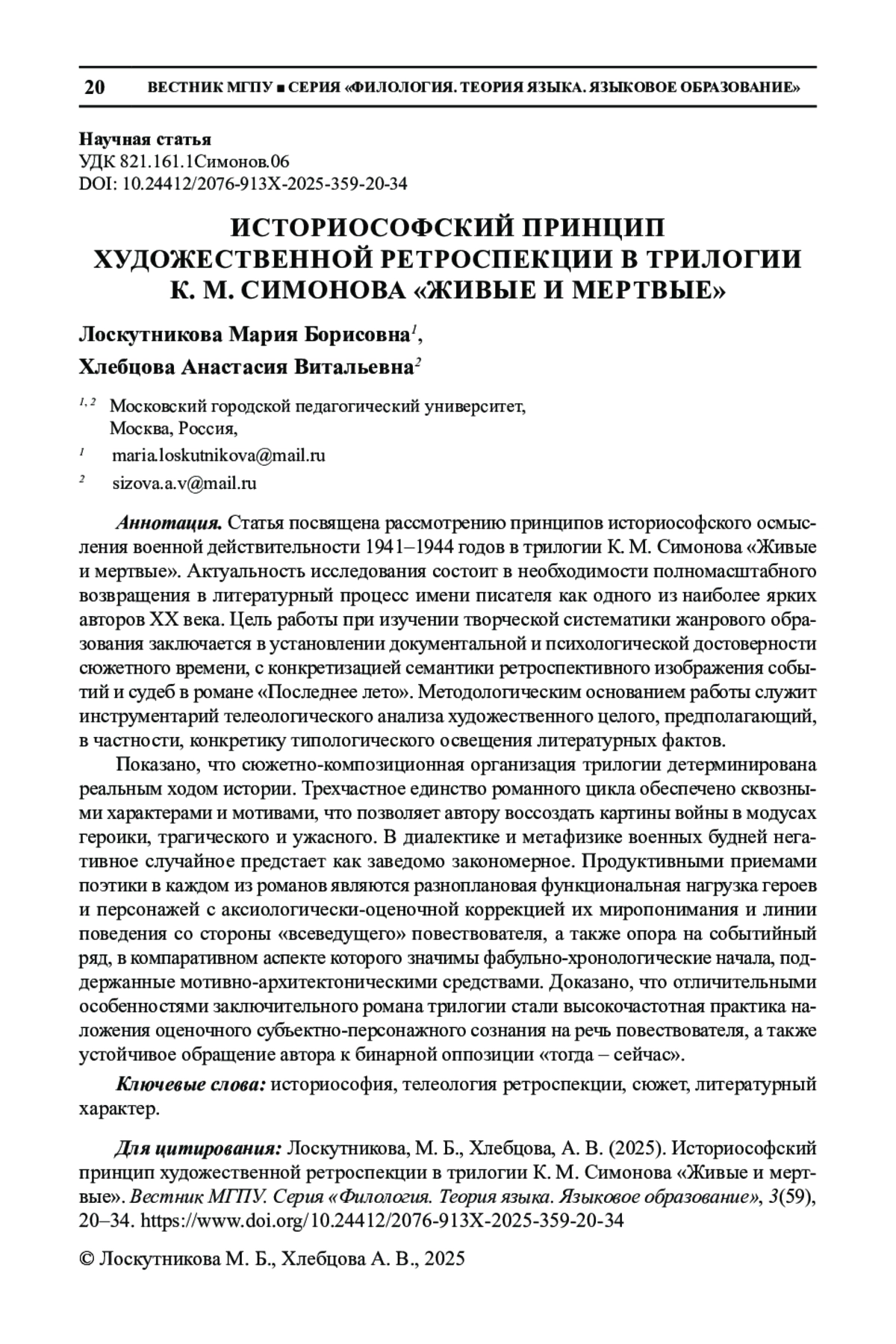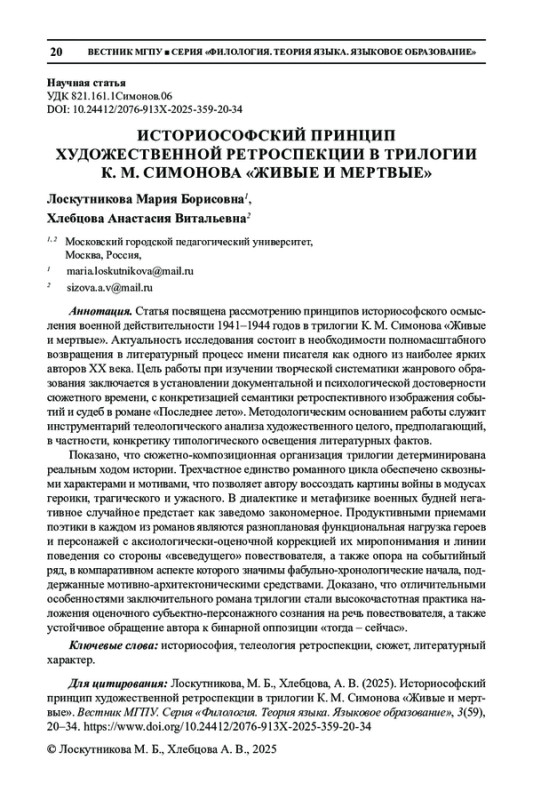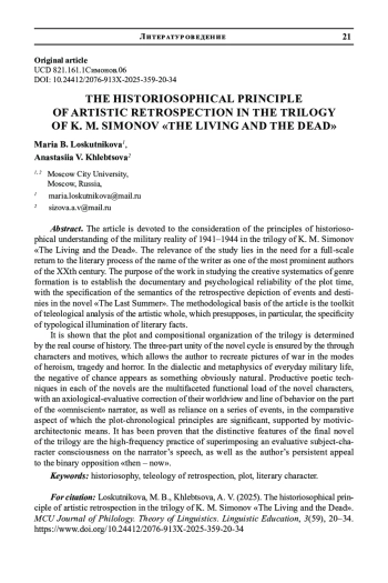 Статья посвящена рассмотрению принципов историософского осмысления военной действительности 1941-1944 годов в трилогии К. М. Симонова «Живые и мертвые». Актуальность исследования состоит в необходимости полномасштабного возвращения в литературный процесс имени писателя как одного из наиболее ярких авторов ХХ века. Цель работы при изучении творческой систематики жанрового образования заключается в установлении документальной и психологической достоверности сюжетного времени, с конкретизацией семантики ретроспективного изображения событий и судеб в романе «Последнее лето». Методологическим основанием работы служит инструментарий телеологического анализа художественного целого, предполагающий, в частности, конкретику типологического освещения литературных фактов. Показано, что сюжетно-композиционная организация трилогии детерминирована реальным ходом истории. Трехчастное единство романного цикла обеспечено сквозными характерами и мотивами, что позволяет автору воссоздать картины войны в модусах героики, трагического и ужасного. В диалектике и метафизике военных будней негативное случайное предстает как заведомо закономерное. Продуктивными приемами поэтики в каждом из романов являются разноплановая функциональная нагрузка героев и персонажей с аксиологически-оценочной коррекцией их миропонимания и линии поведения со стороны «всеведущего» повествователя, а также опора на событийный ряд, в компаративном аспекте которого значимы фабульно-хронологические начала, поддержанные мотивно-архитектоническими средствами. Доказано, что отличительными особенностями заключительного романа трилогии стали высокочастотная практика наложения оценочного субъектно-персонажного сознания на речь повествователя, а также устойчивое обращение автора к бинарной оппозиции «тогда - сейчас».