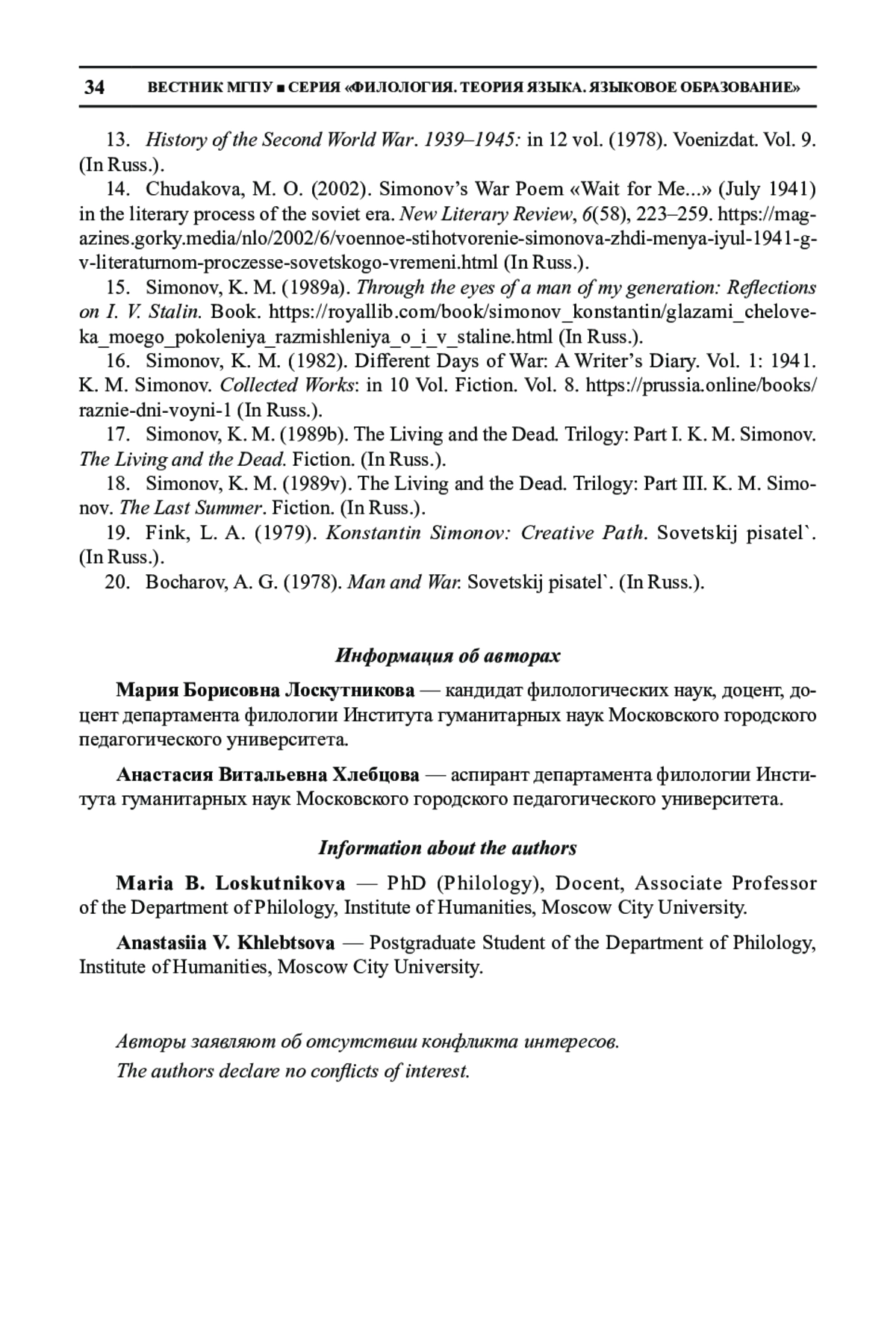 14. Чудакова, М. О. (2002). Военное стихотворение Симонова “Жди меня.”. (июль 1941 г.) в литературном процессе советского времени. Новое литературное обозрение, 6(58), 223-259. https://magazines.gorky.media/nlo/2002/6/voennoe-stihotvorenie-simonova-zhdi-menya-iyul-1941-g-v-literaturnom-proczesse-sovetskogo-vremeni.html.