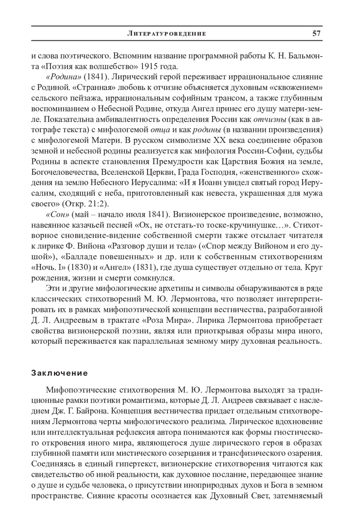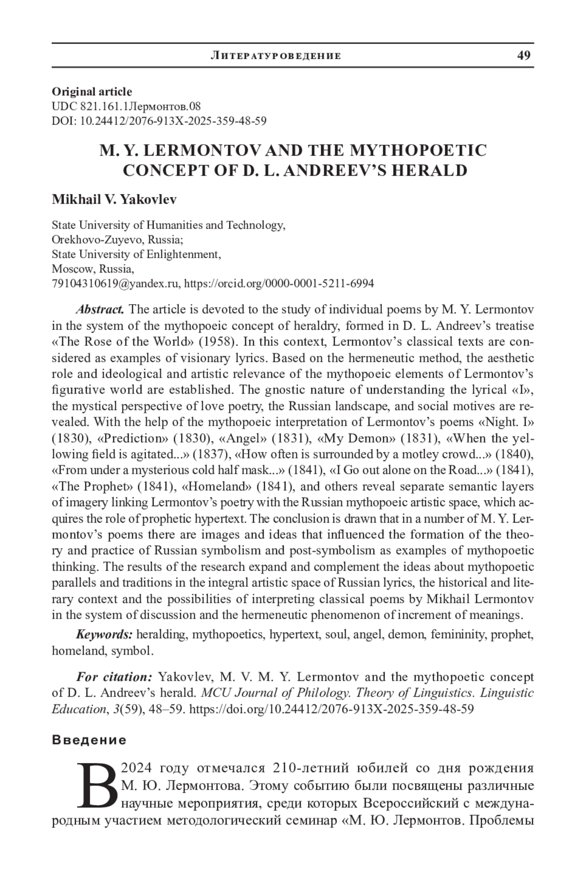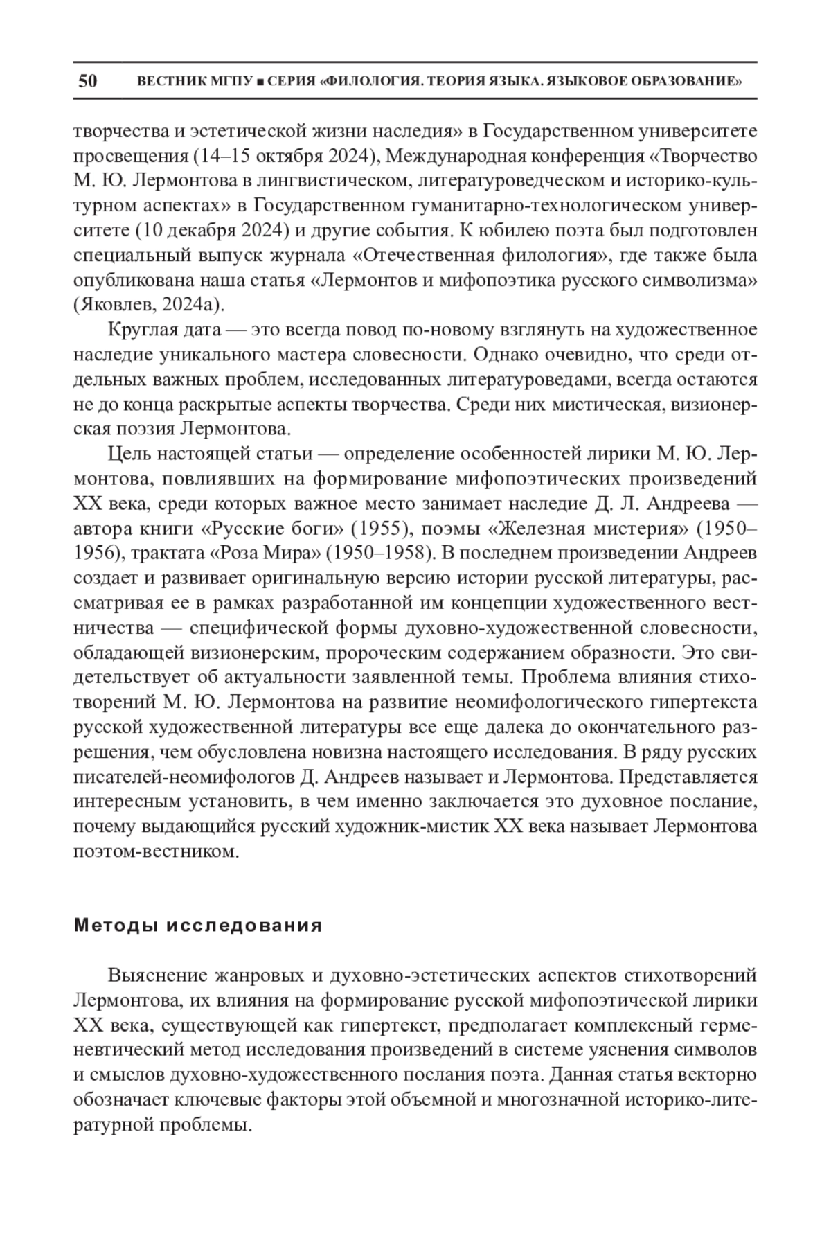 1. Яковлев, М. В. (2024а). Лермонтов и мифопоэтика русского символизма. Отечественная филология, (5), 122-131. EDN: SMPJHI ▼ Контекст