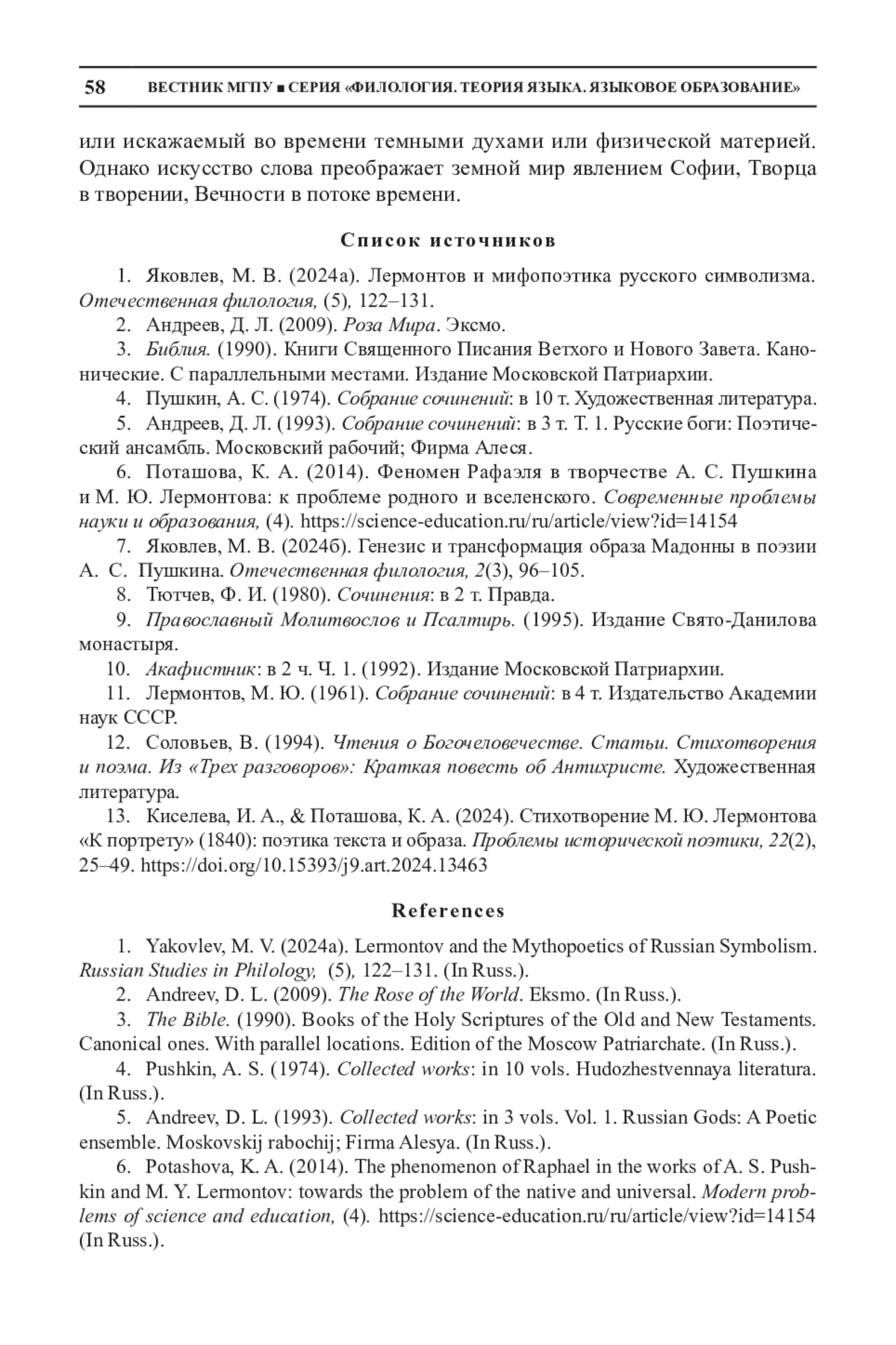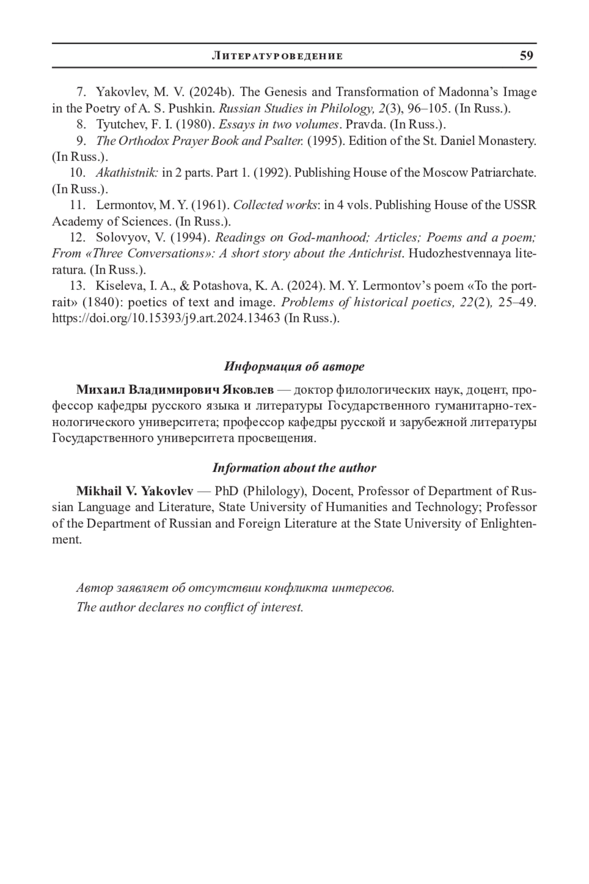 7. Яковлев, М. В. (2024б). Генезис и трансформация образа Мадонны в поэзии А. С. Пушкина. Отечественная филология, 2(3), 96-105. EDN: NZKKJI