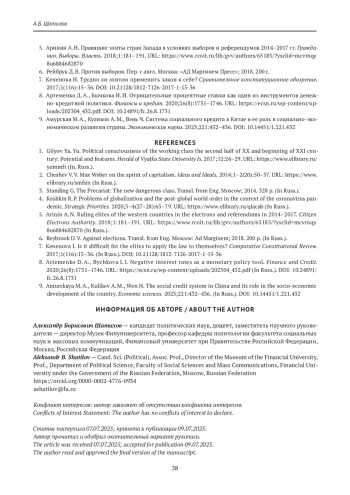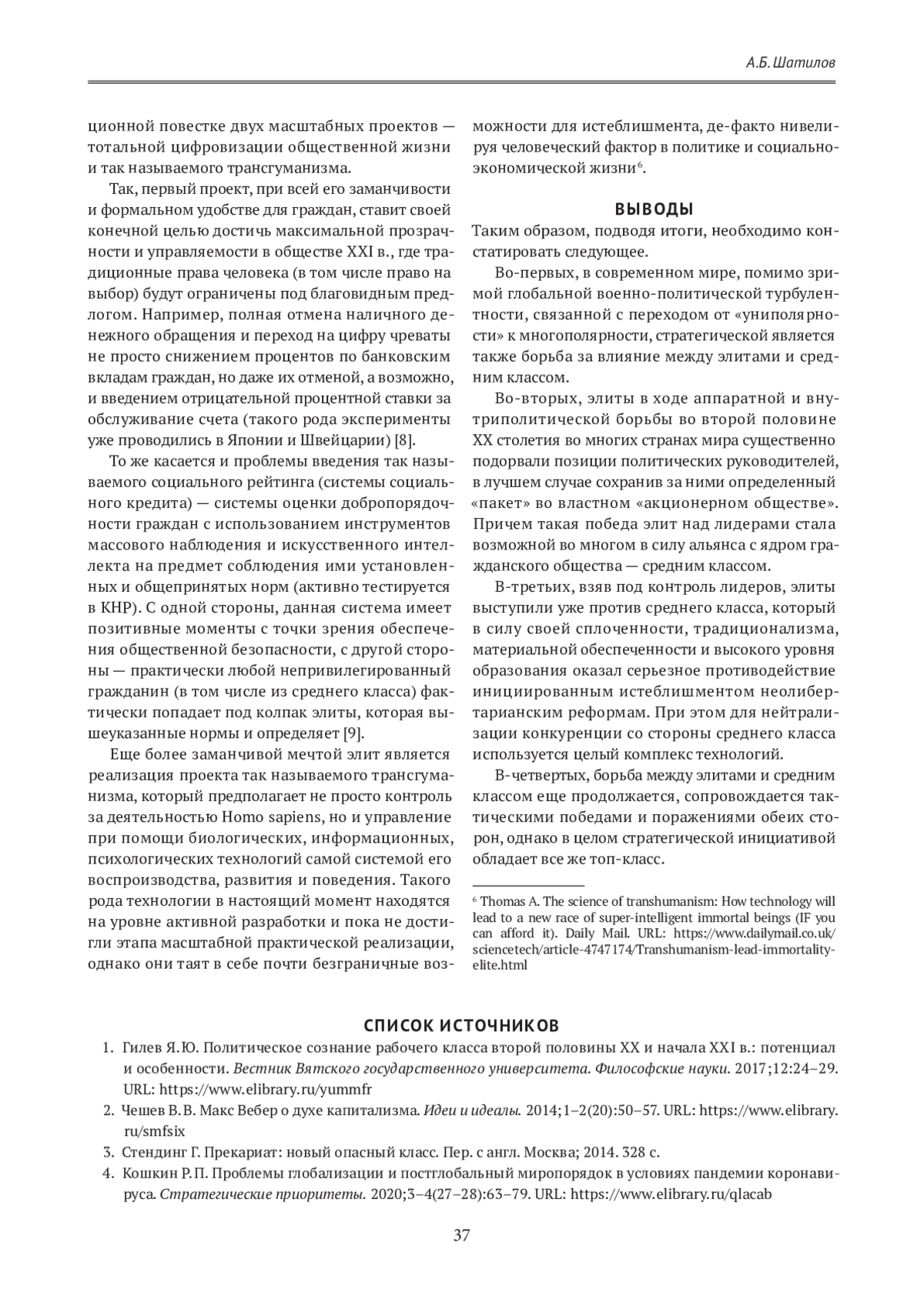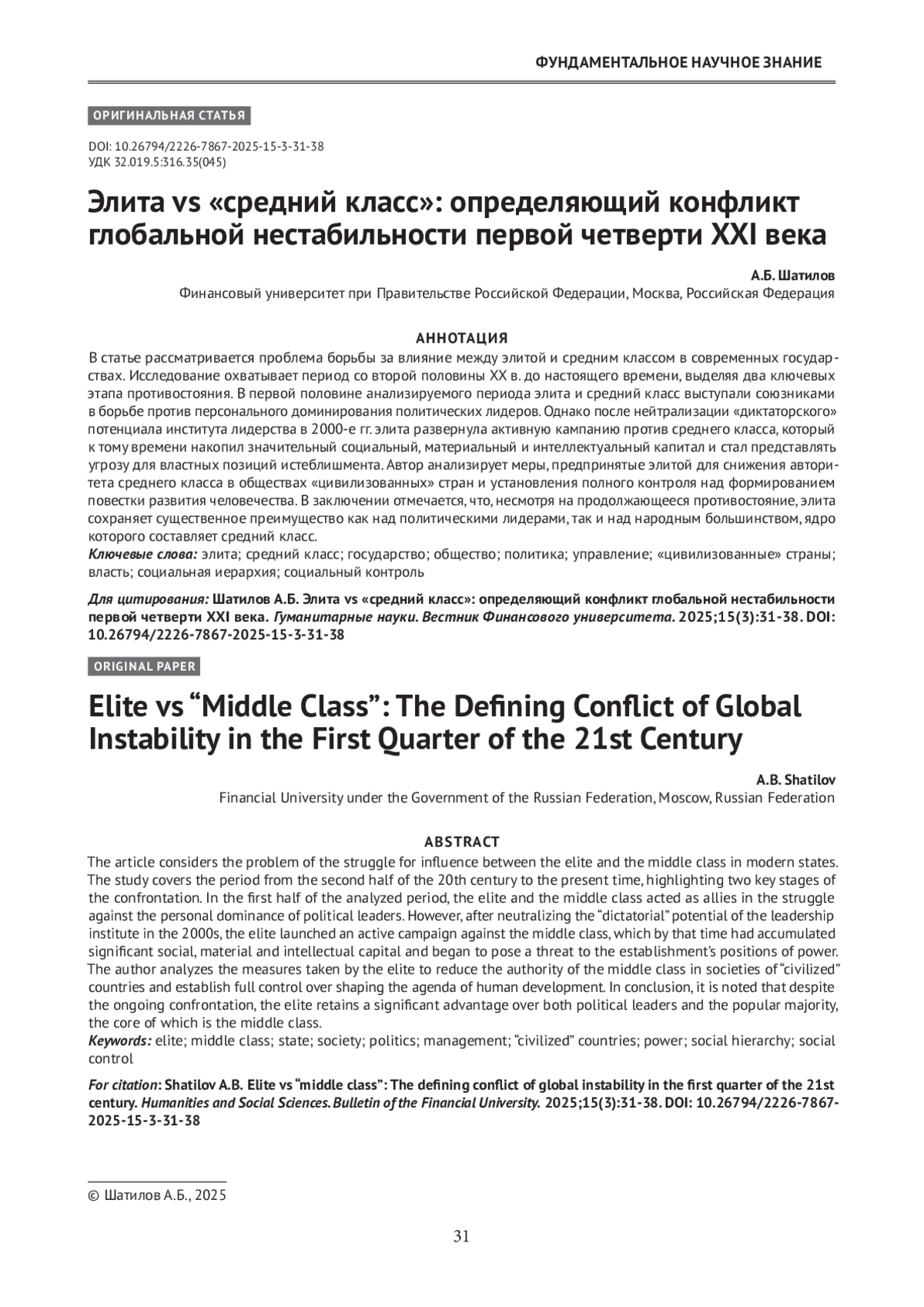 ШАТИЛОВ А. Б. ЭЛИТА VS «СРЕДНИЙ КЛАСС»: ОПРЕДЕЛЯЮЩИЙ КОНФЛИКТ ГЛОБАЛЬНОЙ НЕСТАБИЛЬНОСТИ ПЕРВОЙ ЧЕТВЕРТИ XXI ВЕКА // ГУМАНИТАРНЫЕ НАУКИ. ВЕСТНИК ФИНАНСОВОГО УНИВЕРСИТЕТА. 2025. ТОМ 15, № 3