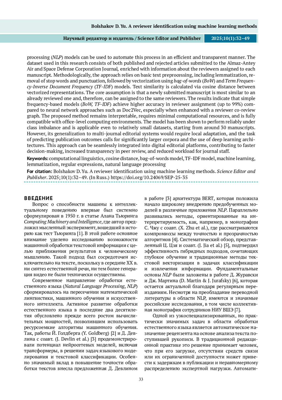 Рассматривается задача автоматического назначения рецензентов на основе исторических данных о ранее поступивших и прорецензированных рукописях. В традиционной редакционной практике подбор экспертов опирается на субъективные решения редактора, что может приводить к задержкам и снижению качества экспертизы. Цель исследования – продемонстрировать, что использование простых моделей обработки естественного языка позволяет эффективно и прозрачно автоматизировать этот процесс. В качестве исходных данных использованы тексты опубликованных и отклоненных рукописей научно-технического журнала «Вестник Концерна ВКО «Алмаз – Антей» (с 2011 по 2024 г.), сопровожденные информацией о назначенных рецензентах. Методологически подход основан на предварительной лемматизации текстов, удалении стоп-слов и знаков пунктуации, а также последующей векторизации с использованием моделей bag-of-words (BoW) и Term Frequency-Inverse Document Frequency (TF-IDF). Близость текстов оценивалось путем вычисления максимального косинусного расстояния между их векторными представлениями. Предполагается, что статья, прорецензированная ранее и демонстрирующая наибольшую близость к поступившей, была рассмотрена рецензентами, которых система может рекомендовать для оценки новой рукописи. Результаты показывают, что простые частотные модели (BoW, TF-IDF) демонстрируют более высокую точность назначения рецензентов (до 99 %) по сравнению с нейросетевыми подходами (например, моделью Doc2Vec), особенно при дополнении графом связей между экспертами. При этом модель остается интерпретируемой, не требует значительных вычислительных ресурсов и может быть реализована на компьютере офисного уровня. Показано, что модель эффективно работает в условиях дисбаланса классов и применима даже к относительно небольшим корпусам, начиная от 30 статей. Однако ее обобщение на мультижурнальные редакции требует локальной адаптации, а для решения задачи прогнозирования вероятности принятия к публикации необходимо существенно увеличить объем выборки и привлечь модели глубокого обучения. Предложенный подход может быть легко интегрирован в цифровые редакционные системы для сокращения времени принятия решений, повышения прозрачности экспертизы и снижения нагрузки на сотрудников журнала.