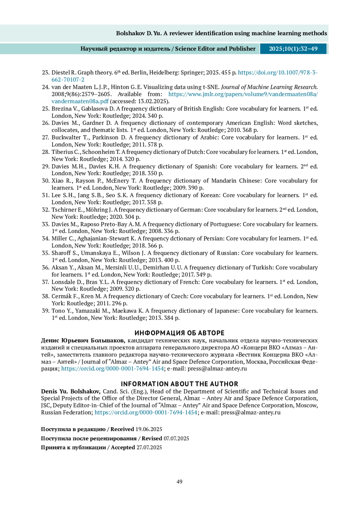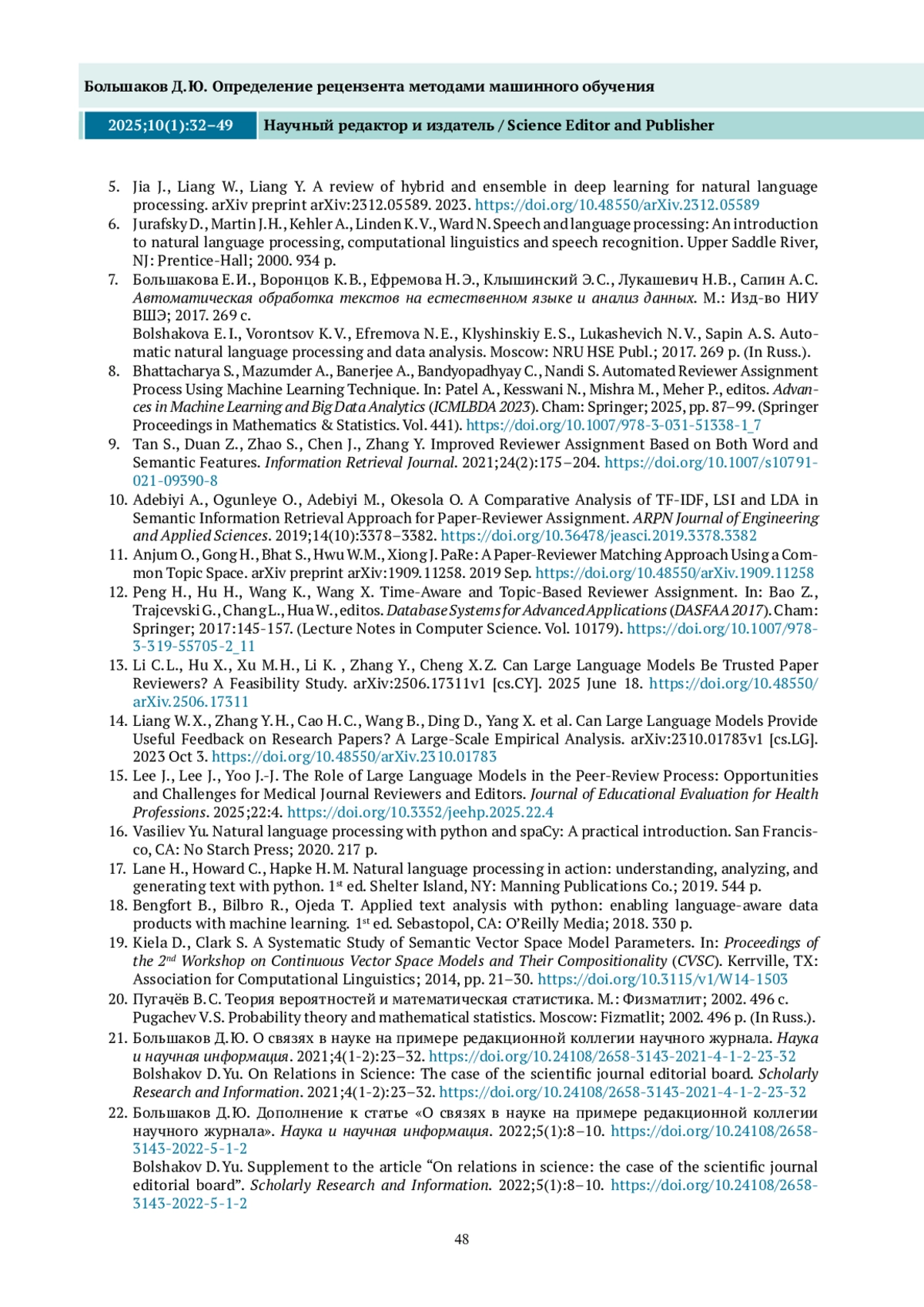 8. Bhattacharya S., Mazumder A., Banerjee A., Bandyopadhyay C., Nandi S. Automated Reviewer Assignment Process Using Machine Learning Technique. In: Patel A., Kesswani N., Mishra M., Meher P., editos. Advances in Machine Learning and Big Data Analytics (ICMLBDA 2023). Cham: Springer; 2025, pp. 87-99. (Springer Proceedings in Mathematics & Statistics. Vol. 441). DOI: 10.1007/978-3-031-51338-1_7