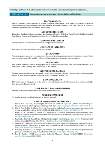 В настоящее время сохраняется устойчивый интерес к оценке надежности систем электронной редакции (СЭР; англ. manuscript management systems, MMS) с точки зрения их содержания, структуры и функциональности. Это связано с тем, что подача статей в журналы в большинстве случаев осуществляется через СЭР, которую редакторы используют для управления этим процессом [1]. В настоящий момент на рынке представлено несколько СЭР, и у каждой есть сильные и слабые стороны [2].