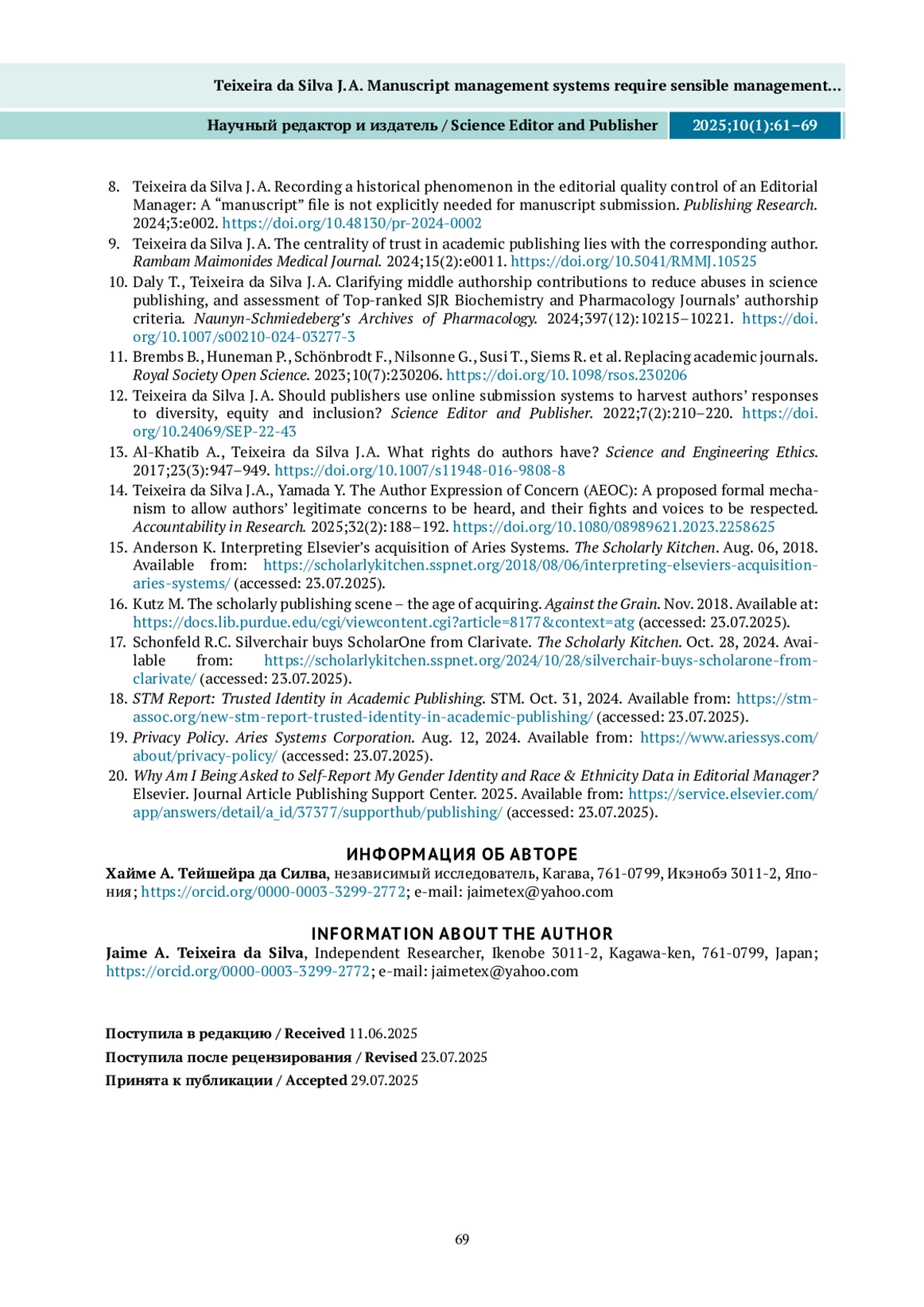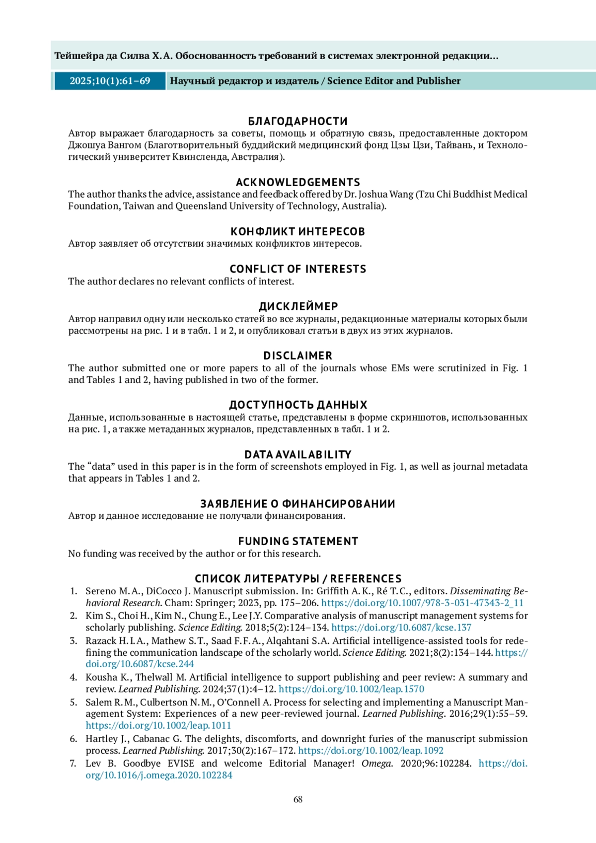 2. Kim S., Choi H., Kim N., Chung E., Lee J.Y.Comparative analysis of manuscript management systems for scholarly publishing. Science Editing. 2018;5(2):124-134. DOI: 10.6087/kcse.137