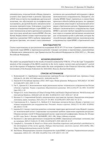 8. Куклина Е. А. Два трека арктического сотрудничества БРИКС. Евразийская интеграция: экономика, право, политика. 2023;17:3(45):25-37. https://doi.org/10.22394/2073-2929-2023-03-25-37