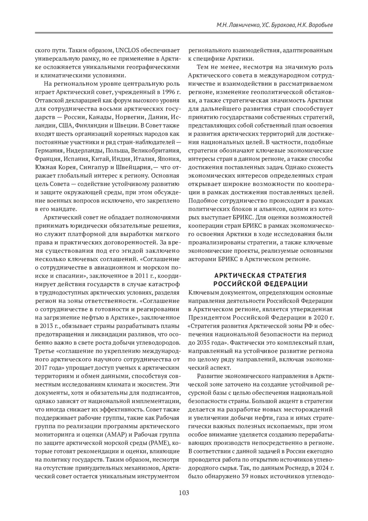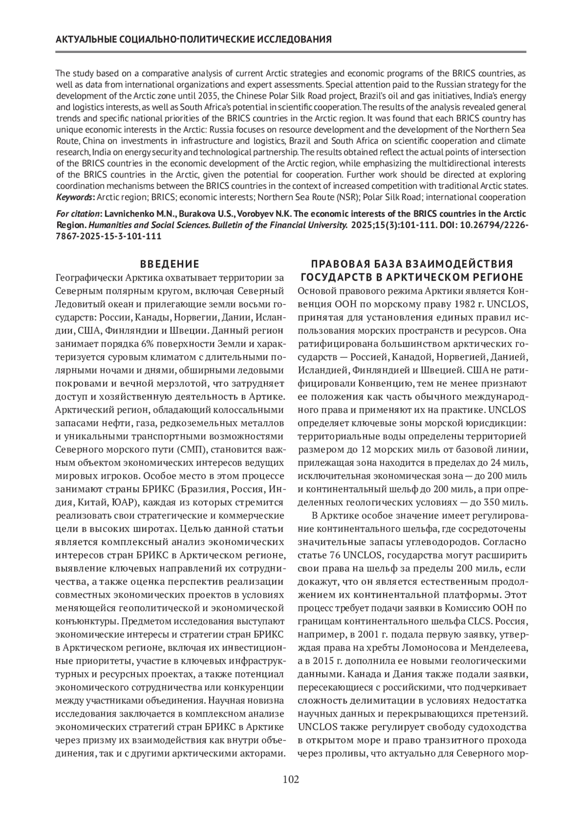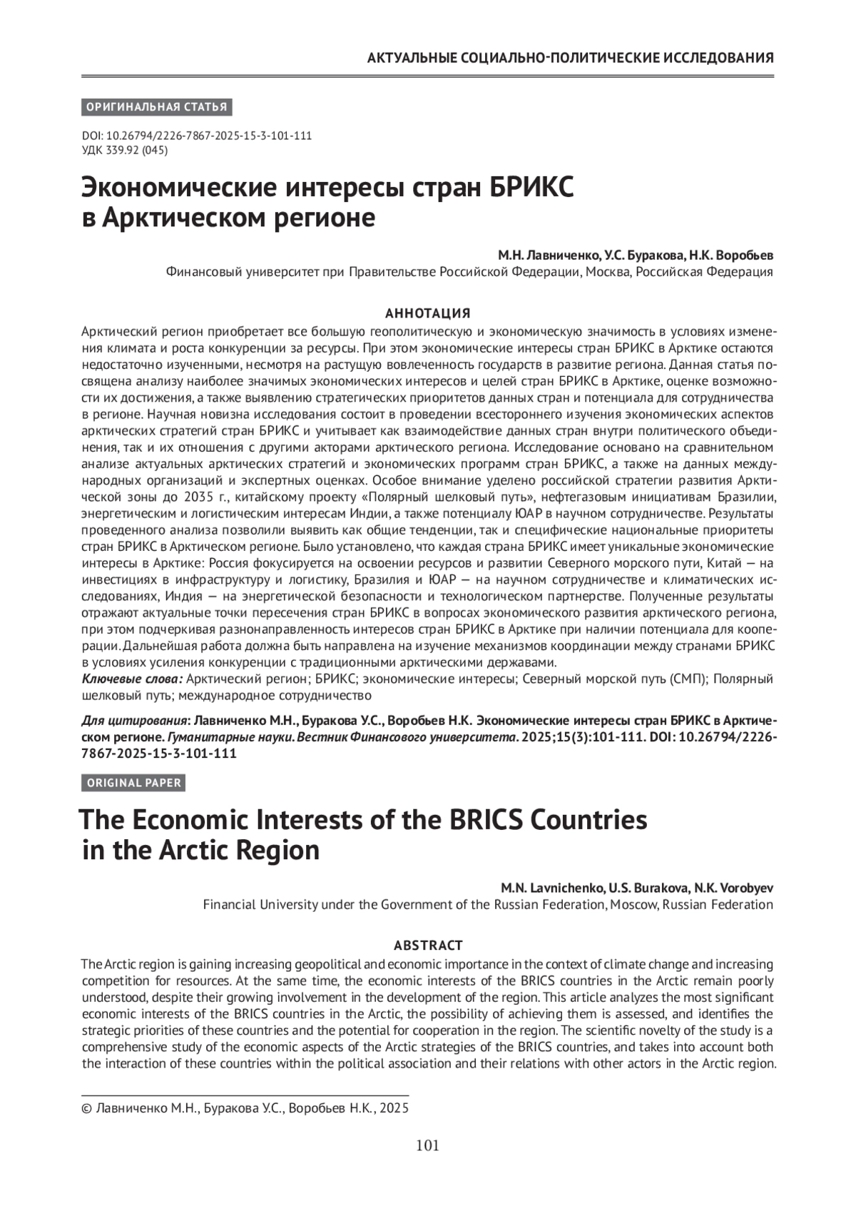 Арктический регион приобретает все большую геополитическую и экономическую значимость в условиях изменения климата и роста конкуренции за ресурсы. При этом экономические интересы стран БРИКС в Арктике остаются недостаточно изученными, несмотря на растущую вовлеченность государств в развитие региона. Данная статья посвящена анализу наиболее значимых экономических интересов и целей стран БРИКС в Арктике, оценке возможности их достижения, а также выявлению стратегических приоритетов данных стран и потенциала для сотрудничества в регионе. Научная новизна исследования состоит в проведении всестороннего изучения экономических аспектов арктических стратегий стран БРИКС и учитывает как взаимодействие данных стран внутри политического объединения, так и их отношения с другими акторами арктического региона. Исследование основано на сравнительном анализе актуальных арктических стратегий и экономических программ стран БРИКС, а также на данных международных организаций и экспертных оценках. Особое внимание уделено российской стратегии развития Арктической зоны до 2035 г., китайскому проекту «Полярный шелковый путь», нефтегазовым инициативам Бразилии, энергетическим и логистическим интересам Индии, а также потенциалу ЮАР в научном сотрудничестве. Результаты проведенного анализа позволили выявить как общие тенденции, так и специфические национальные приоритеты стран БРИКС в Арктическом регионе. Было установлено, что каждая страна БРИКС имеет уникальные экономические интересы в Арктике: Россия фокусируется на освоении ресурсов и развитии Северного морского пути, Китай — на инвестициях в инфраструктуру и логистику, Бразилия и ЮАР — на научном сотрудничестве и климатических исследованиях, Индия — на энергетической безопасности и технологическом партнерстве. Полученные результаты отражают актуальные точки пересечения стран БРИКС в вопросах экономического развития арктического региона, при этом подчеркивая разнонаправленность интересов стран БРИКС в Арктике при наличии потенциала для кооперации. Дальнейшая работа должна быть направлена на изучение механизмов координации между странами БРИКС в условиях усиления конкуренции с традиционными арктическими державами.