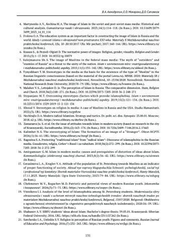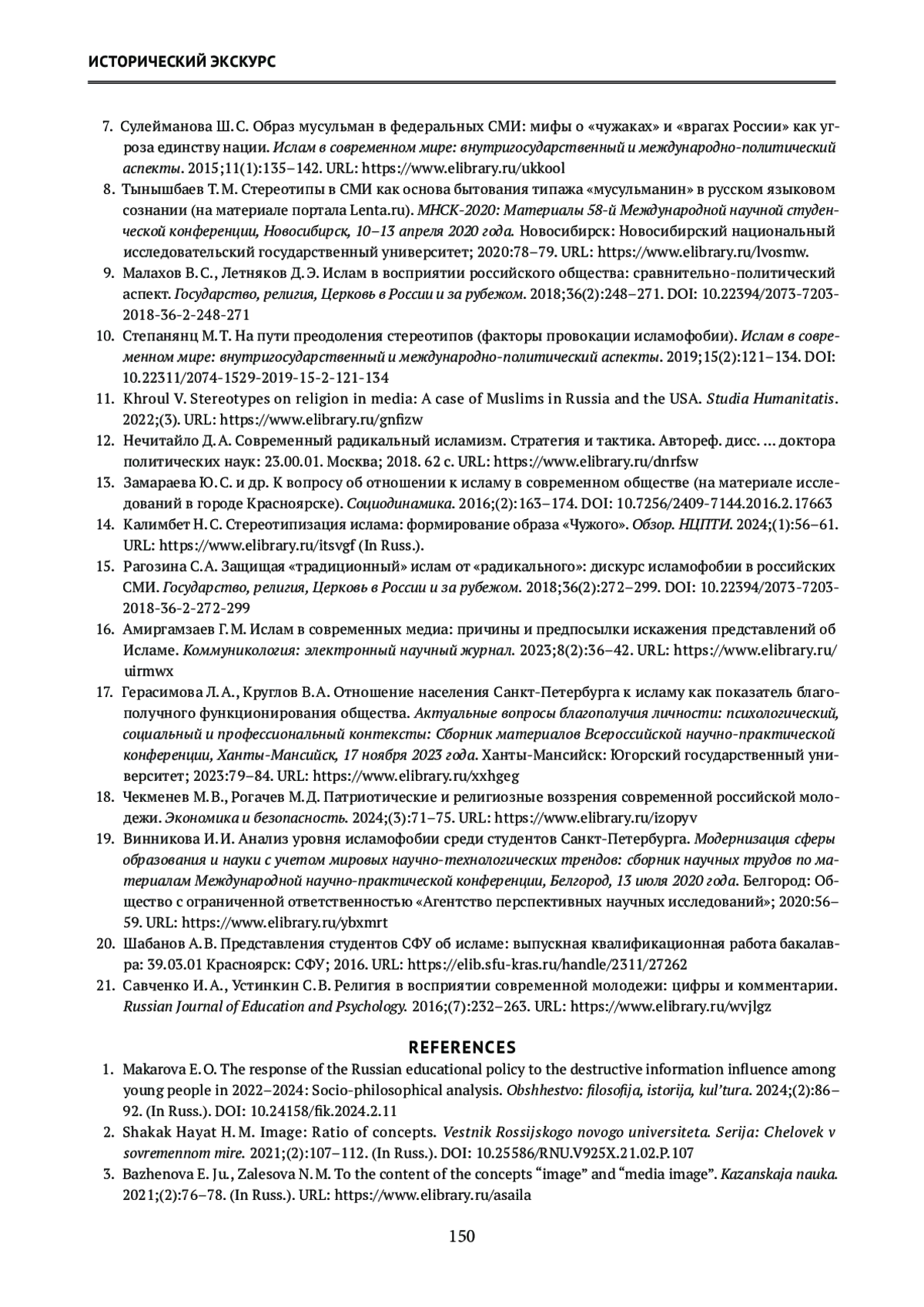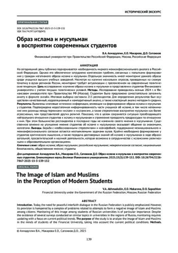 На сегодняшний день публично подчеркивается необходимость мирного межконфессионального диалога в Российской Федерации. Однако его обеспечение затруднено комплексом проблем, связанных с попытками формирования у граждан негативного образа ислама и мусульман. Отдельную значимость имеет мониторинг данного образа среди учащихся высших учебных заведений. Несмотря на наличие нескольких опросов, проведенных на схожую тематику в вузах регионов России, мониторинг требует актуализации с преломлением на современные политические тенденции. Цель исследования: изучение образа ислама и мусульман в представлении студентов Финансового университета с учетом текущих политических условий. Методы. Исследование проводилось осенью 2024 г. в Финансовом университете при Правительстве РФ (Москва). Студентам было предложено самостоятельно заполнить анкету в формате онлайн. Итоговая выборка составила 215 респондентов. Для определения результатов был осуществлен качественный, корреляционный и компаративный анализ, а также кластерный анализ методом k-средних. Результаты. Выявлены ключевые источники информации, влияющие на формирование образа ислама и мусульман у студентов. Подтверждена недостаточная информированность части учащихся об исламе, в том числе непонимание ими разницы между терминами «ислам» и «исламизм», а также стереотипное восприятие мусульман как более агрессивных, чем представителей других религий. Показано, что в целом сохраняется ситуация преобладающего нейтрального отношения студентов к исламу и мусульманам и стремления преодолеть предрассудки по отношению к ним. При этом большинство респондентов в последние годы не изменило своего мнения о мусульманах. Существенное влияние на улучшение мнения студентов об исламе и мусульманах оказывает общение со знакомыми, коллегами. Выводы. Борьба с необоснованными стереотипами и ксенофобией, поддержание межнационального и межконфессионального согласия остаются неотъемлемыми задачами вузов. Крайне необходимо формирование у студентов критического мышления, а также передача достоверных знаний об исламе и мусульманах в ходе образовательной, просветительской и научной деятельности, которая возможна в сотрудничестве с исламскими религиозными и образовательными организациями.
