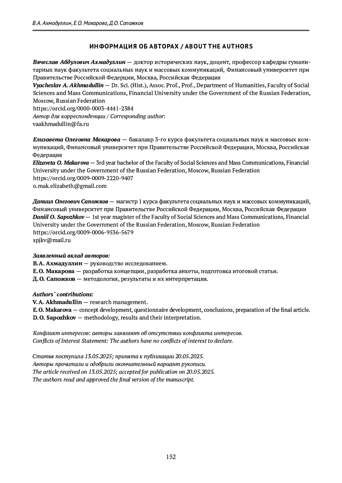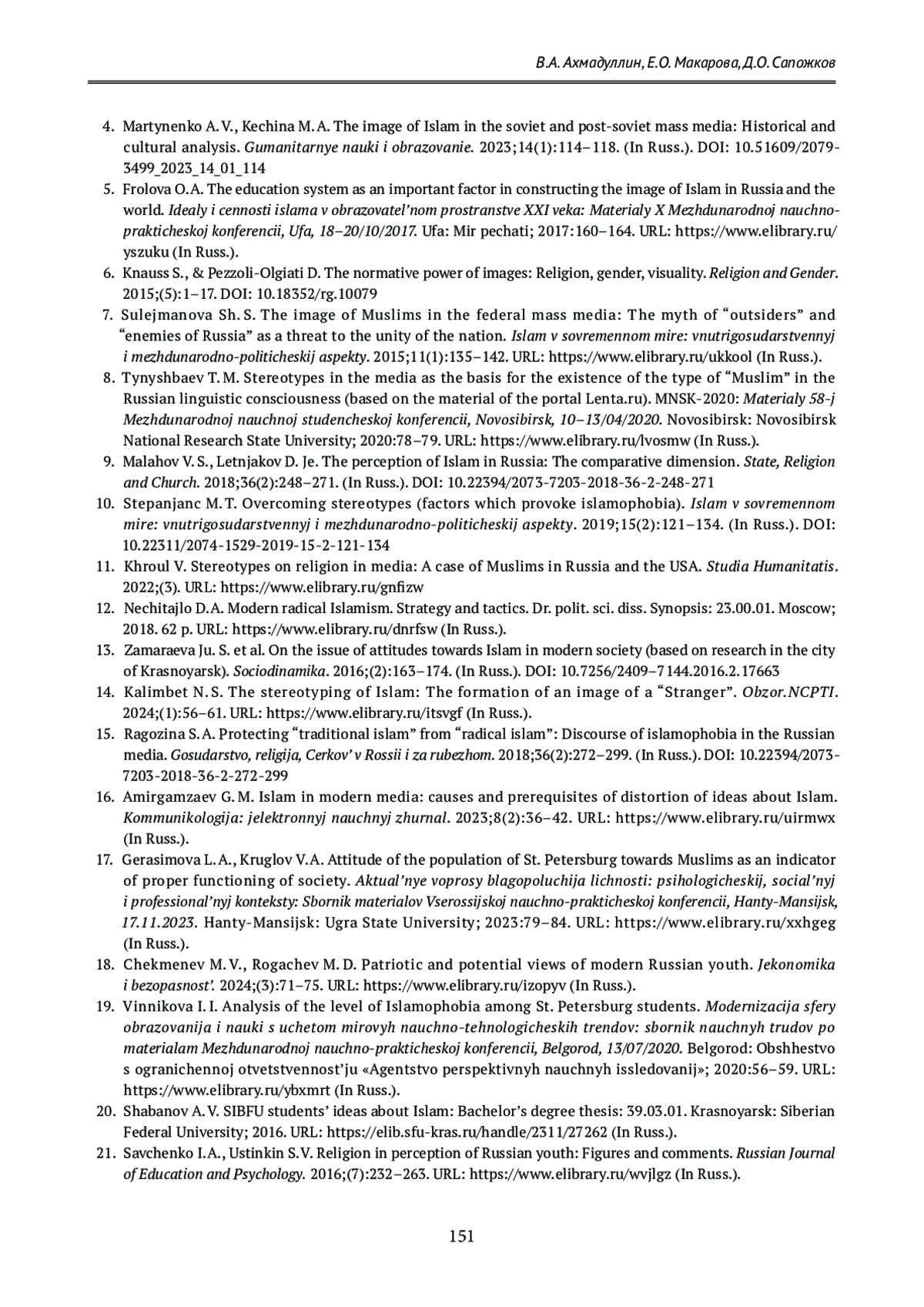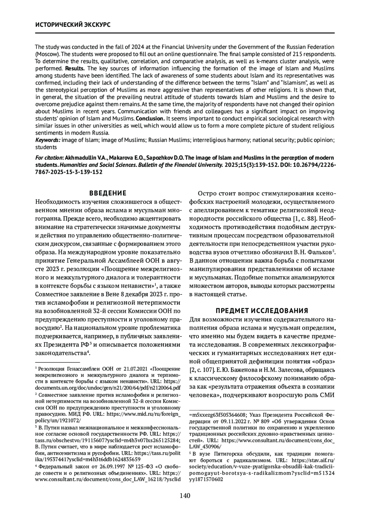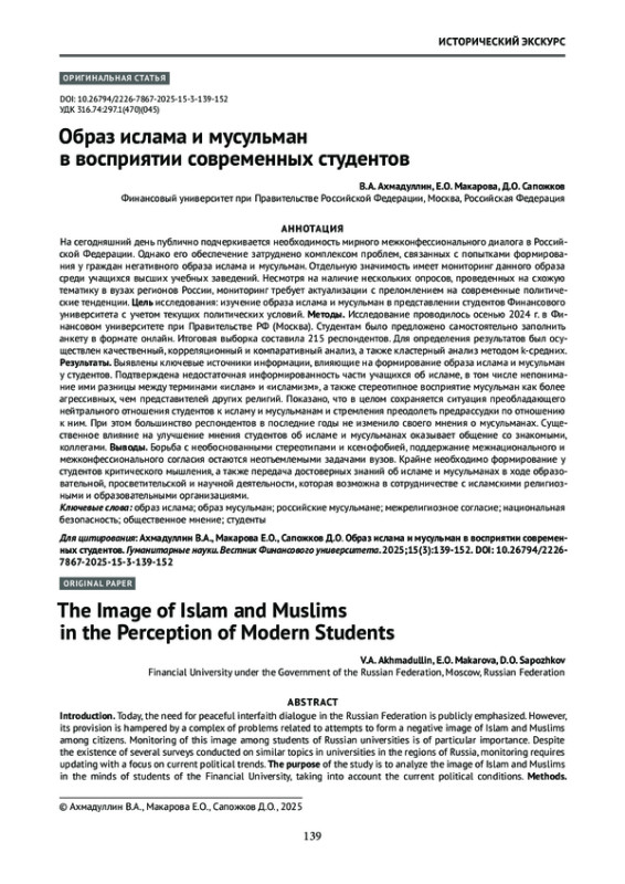 АХМАДУЛЛИН В. А., МАКАРОВА Е. О., САПОЖКОВ Д. О. ОБРАЗ ИСЛАМА И МУСУЛЬМАН В ВОСПРИЯТИИ СОВРЕМЕННЫХ СТУДЕНТОВ // ГУМАНИТАРНЫЕ НАУКИ. ВЕСТНИК ФИНАНСОВОГО УНИВЕРСИТЕТА. 2025. ТОМ 15, № 3