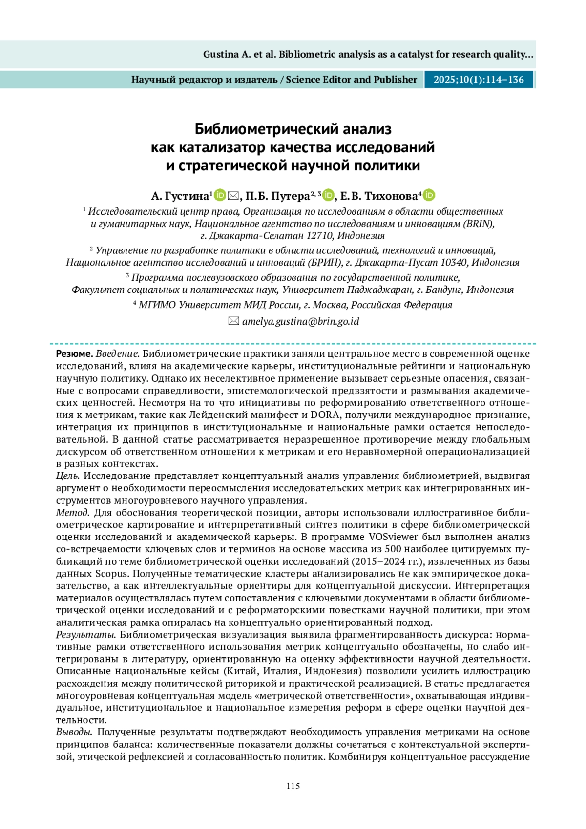Введение. Библиометрические практики заняли центральное место в современной оценке исследований, влияя на академические карьеры, институциональные рейтинги и национальную научную политику. Однако их неселективное применение вызывает серьезные опасения, связанные с вопросами справедливости, эпистемологической предвзятости и размывания академических ценностей. Несмотря на то что инициативы по реформированию ответственного отношения к метрикам, такие как Лейденский манифест и DORA, получили международное признание, интеграция их принципов в институциональные и национальные рамки остается непоследовательной. В данной статье рассматривается неразрешенное противоречие между глобальным дискурсом об ответственном отношении к метрикам и его неравномерной операционализацией в разных контекстах. Цель. Исследование представляет концептуальный анализ управления библиометрией, выдвигая аргумент о необходимости переосмысления исследовательских метрик как интегрированных инструментов многоуровневого научного управления. Метод. Для обоснования теоретической позиции, авторы использовали иллюстративное библиометрическое картирование и интерпретативный синтез политики в сфере библиометрической оценки исследований и академической карьеры. В программе VOSviewer был выполнен анализ со-встречаемости ключевых слов и терминов на основе массива из 500 наиболее цитируемых публикаций по теме библиометрической оценки исследований (2015–2024 гг.), извлеченных из базы данных Scopus. Полученные тематические кластеры анализировались не как эмпирическое доказательство, а как интеллектуальные ориентиры для концептуальной дискуссии. Интерпретация материалов осуществлялась путем сопоставления с ключевыми документами в области библиометрической оценки исследований и с реформаторскими повестками научной политики, при этом аналитическая рамка опиралась на концептуально ориентированный подход. Результаты. Библиометрическая визуализация выявила фрагментированность дискурса: нормативные рамки ответственного использования метрик концептуально обозначены, но слабо интегрированы в литературу, ориентированную на оценку эффективности научной деятельности. Описанные национальные кейсы (Китай, Италия, Индонезия) позволили усилить иллюстрацию расхождения между политической риторикой и практической реализацией. В статье предлагается многоуровневая концептуальная модель «метрической ответственности», охватывающая индивидуальное, институциональное и национальное измерения реформ в сфере оценки научной деятельности. Выводы. Полученные результаты подтверждают необходимость управления метриками на основе принципов баланса: количественные показатели должны сочетаться с контекстуальной экспертизой, этической рефлексией и согласованностью политик. Комбинируя концептуальное рассуждения с эмпирическими иллюстрациями, статья вносит вклад в теоретическое обоснование ответственного отношения к метрикам и предлагает рефлексивную рамку для выстраивания научной политики и институциональных реформ в цифровую эпоху.