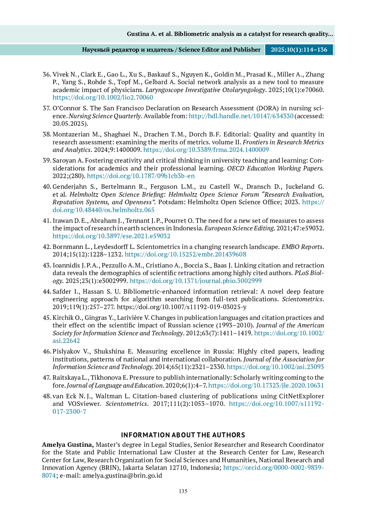 38. Монтазериан М., Шагаи Н., Драхен Т. М., Дорч Б. Ф. Редакционная статья: Качество и количество в оценке исследований: анализ преимуществ метрик. Том II. Frontiers in Research Metrics and Analytics. 2024;9:1400009. DOI: 10.3389/frma.2024.1400009