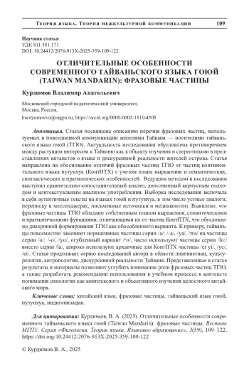 Статья посвящена описанию перечня фразовых частиц, используемых в повседневной коммуникации жителями Тайваня - носителями тайваньского языка гоюй (ТГЮ). Актуальность исследования обусловлена противоречием между растущим интересом к Тайваню как к объекту изучения и стереотипами в представлениях китаистов о языке и дискурсивной реальности жителей острова. Статья направлена на обоснование отличий фразовых частиц ТГЮ от частиц континентального языка путунхуа (КонтПТХ) с учетом плана выражения и семантических, синтаксических и прагматических особенностей. Ведущим методом в исследовании выступил сравнительно-сопоставительный анализ, дополненный корпусным подходом и контекстуальным анализом употребления. Выборка исследования включала в себя аутентичные тексты на языках гоюй и путунхуа, в том числе устные диалоги, переписку в мессенджерах, письменные источники и медиаконтент. Выявлено, что фразовые частицы ТГЮ обладают собственным планом выражения, семантическими и прагматическими функциями, отличающими их от частиц КонтПТХ, что обусловлено диахронией формирования ТГЮ как обособленного варианта. К примеру, тайваньцы повсеместно заменяют нормативные частицы серии /а/: /-а/, /ya/, /wa/ на частицы серии /o/: /-o/, /yo/, огубленный вариант ©о/, часто используют частицы серии /lo:/ вместо серии Да/, широко используют архаичные для КонтПТХ частицы /er yi/, /ye/, /ei/. Статья продолжает серию исследований автора в области лингвистики, культурологии, антропологии, дискурсивной реальности Тайваня. Представленные в статье результаты и материалы позволяют углубить понимание роли фразовых частиц ТГЮ, а также разработать рекомендации использования в учебном процессе в контексте понимания синологии как комплексного и объективного изучения целостного китайского мира.