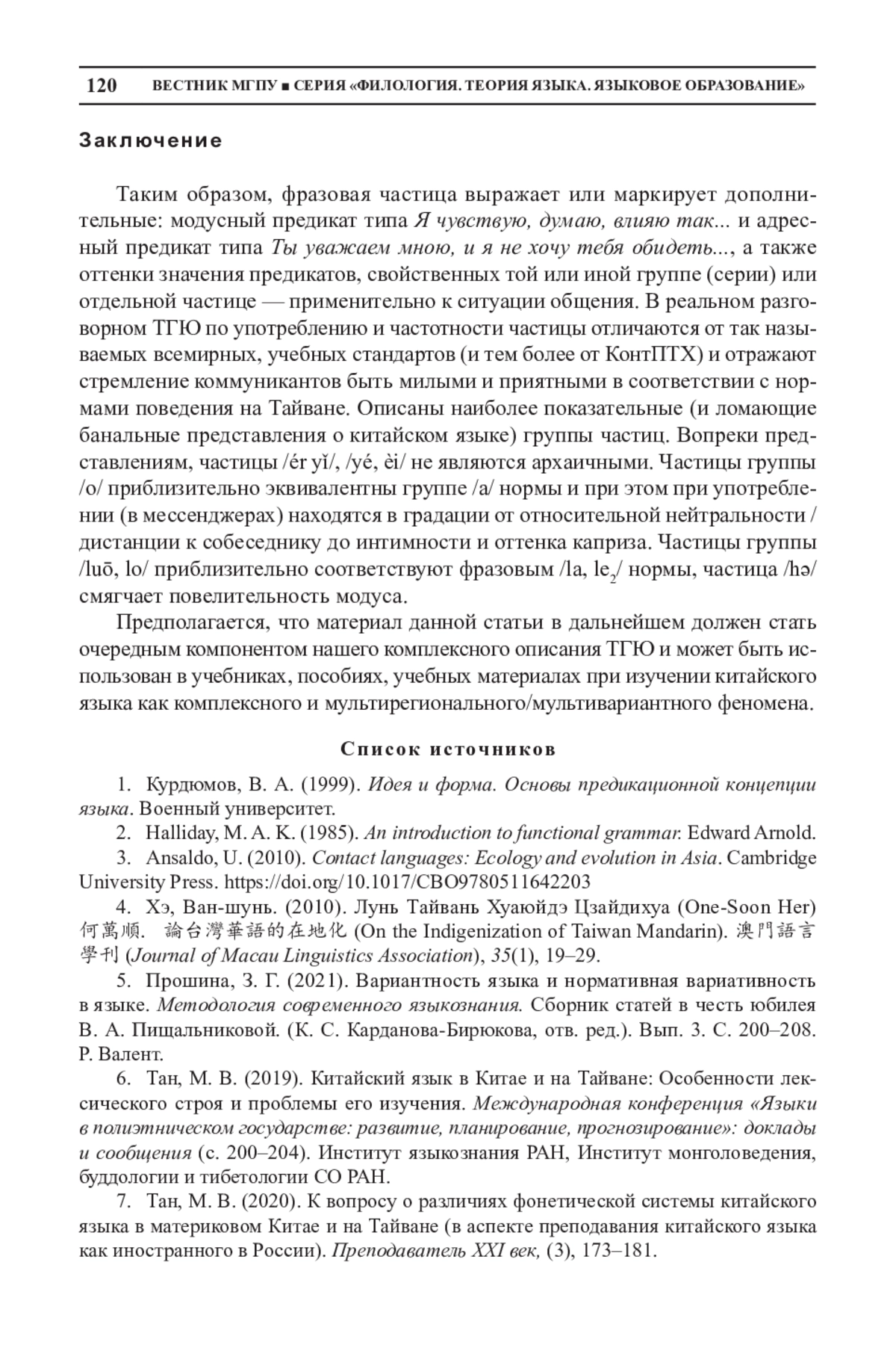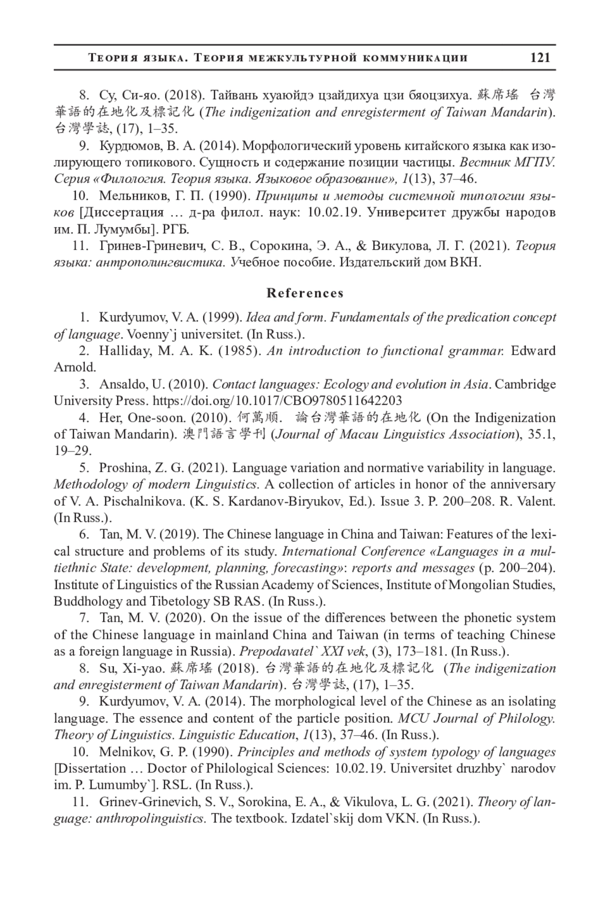6. Тан, М. В. (2019). Китайский язык в Китае и на Тайване: Особенности лексического строя и проблемы его изучения. Международная конференция “Языки в полиэтническом государстве: развитие, планирование, прогнозирование”: доклады и сообщения (с. 200-204). Институт языкознания РАН, Институт монголоведения, буддологии и тибетологии СО РАН.