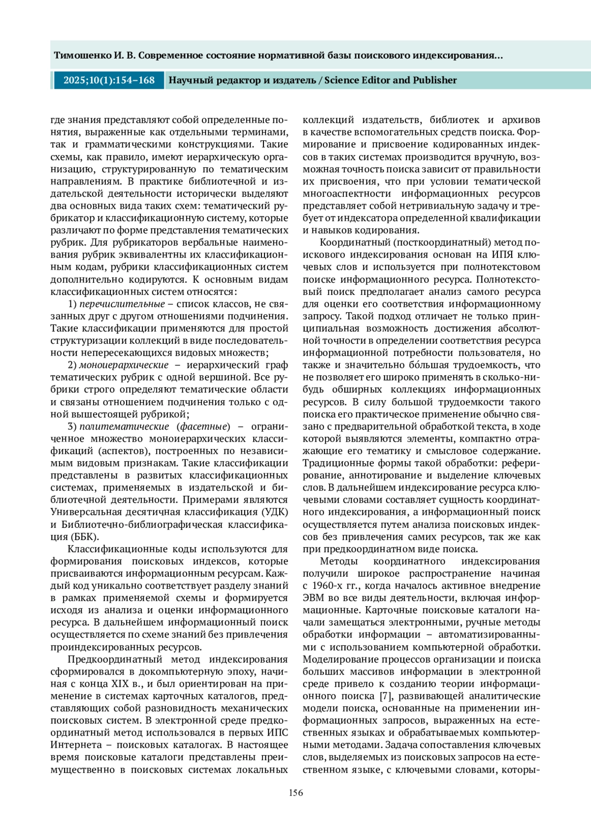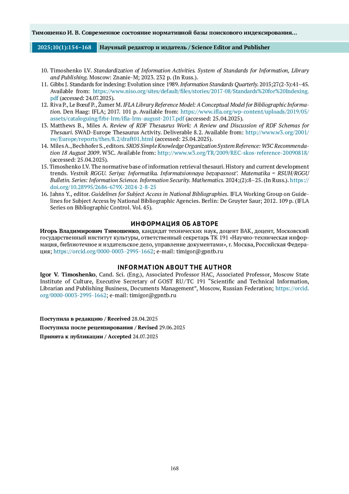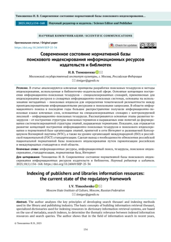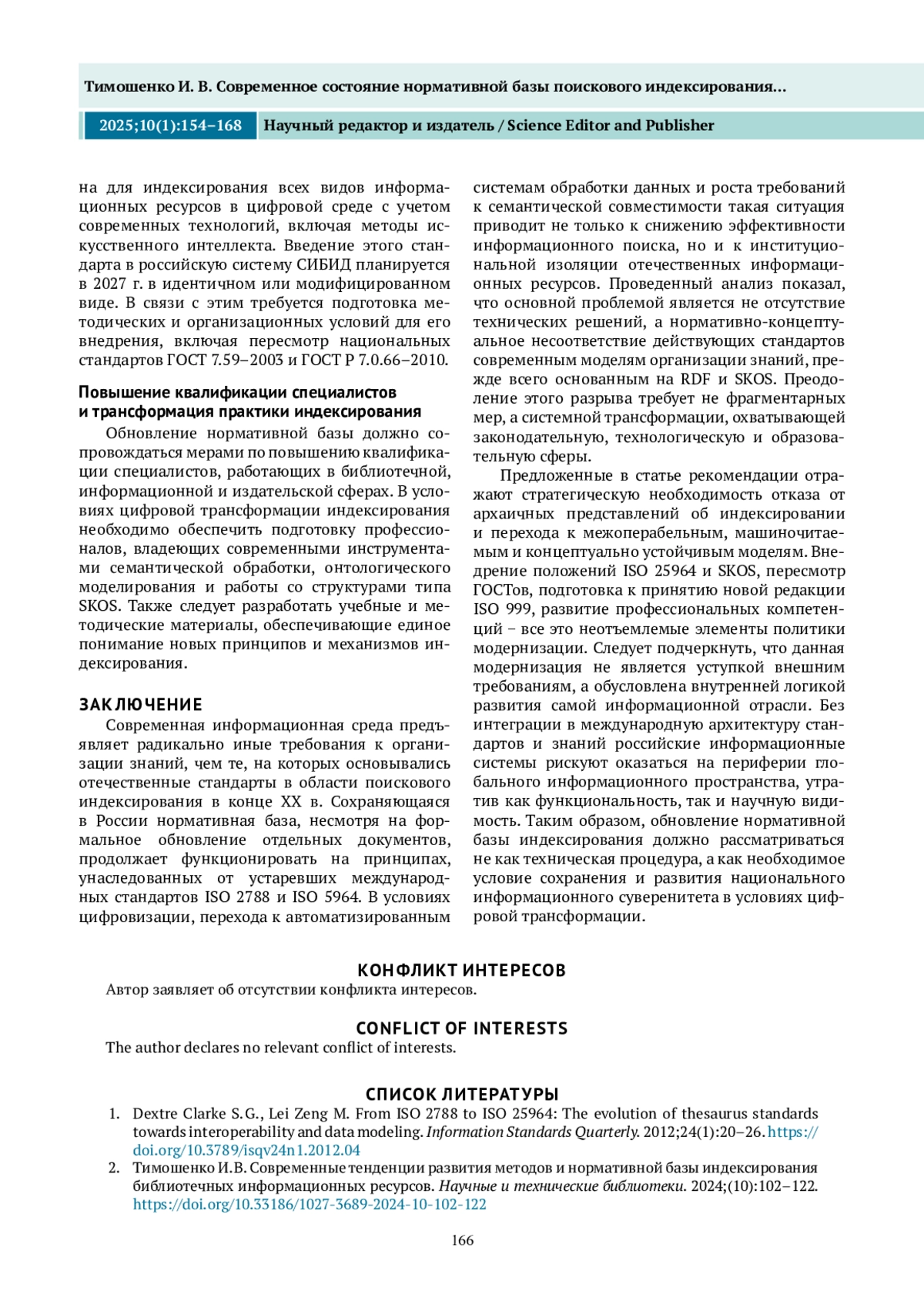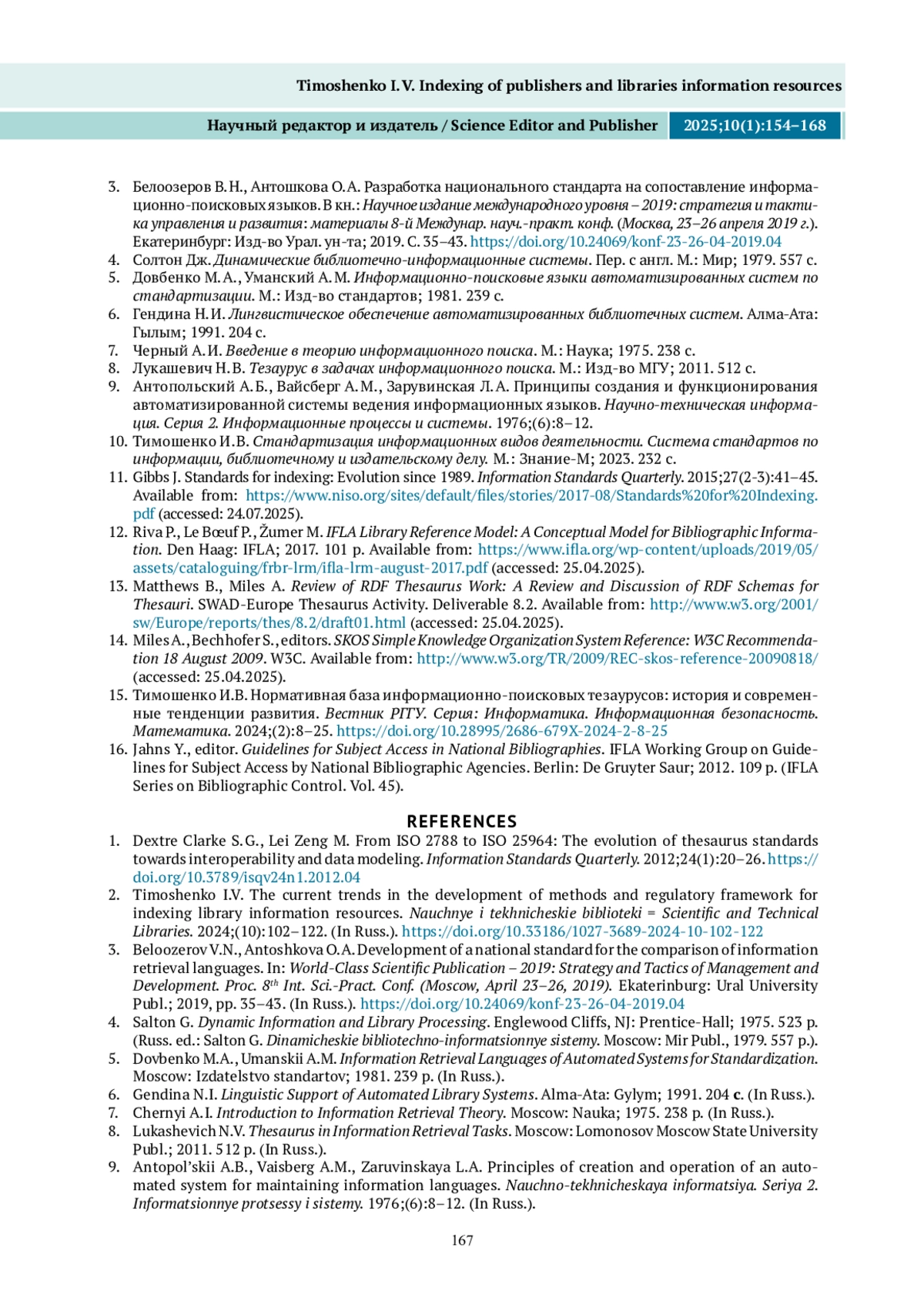 2. Тимошенко И. В. Современные тенденции развития методов и нормативной базы индексирования библиотечных информационных ресурсов. Научные и технические библиотеки. 2024;(10):102-122. DOI: 10.33186/1027-3689-2024-10-102-122