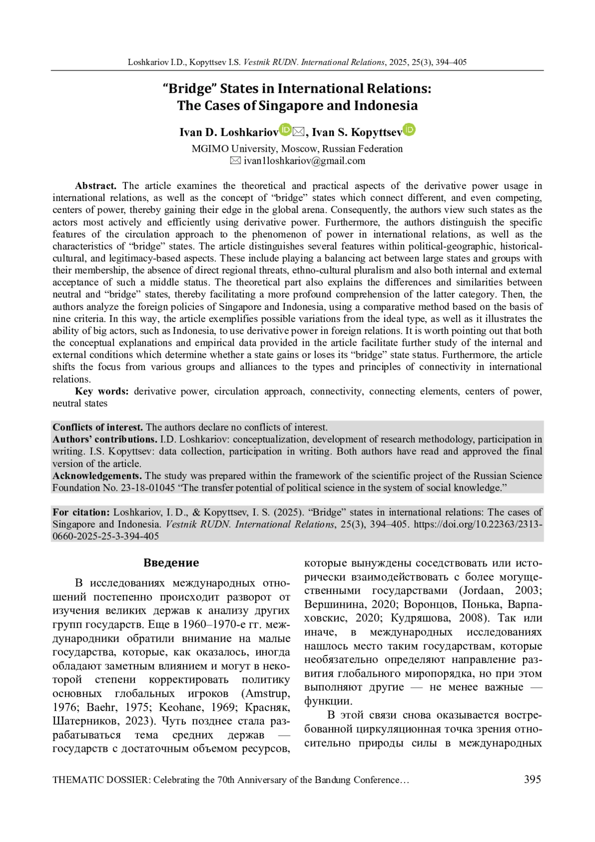 Исследование посвящено анализу теоретических и практических аспектов использования деривативной силы в международных отношениях и концепции страны-«моста» - связующего звена между различными, в том числе и враждебными, центрами силы, опирающегося на свое промежуточное положение как конкурентное преимущество на мировой арене. Рассматривая подобные государства в качестве акторов, наиболее активно и эффективно использующих деривативную силу, авторы выявляют специфику циркуляционного подхода к феномену силы в международных отношениях и черты, присущие стране-«мосту». В рамках трех аспектов - политико - географического, историко-культурного и статусно-легитимного - в качестве характеристик, присущих государствам-«мостам», выделяются сбалансированность внешнеполитического курса по отношению к крупным государствам или группам с их участием, отсутствие прямых региональных угроз, этнокультурный плюрализм, а также внутреннее и внешнее принятие и признание посреднического статуса государств-«мостов». В теоретической части исследования также объяснены различия и сходства между нейтральным государством и страной-«мостом», что в значительной степени упрощает понимание последней категории. Опираясь на сравнительно-сопоставительный метод, в рамках которого проанализировано девять отличительных черт государств-«мостов», рассмотрена внешняя политика Сингапура и Индонезии, что позволяет не только выявить возможные отклонения от идеал-типической модели, но и продемонстрировать способность крупных акторов вроде Индонезии использовать деривативную силу в международных делах. Концептуальные объяснения и эмпирические данные исследования открывают широкие возможности для дальнейшего изучения внутренних и внешних условий приобретения и утраты статуса страны-«моста», а также создают предпосылки для смещения акцента с исследования групп и альянсов на изучение типов и принципов формирования связанности в международных отношениях.