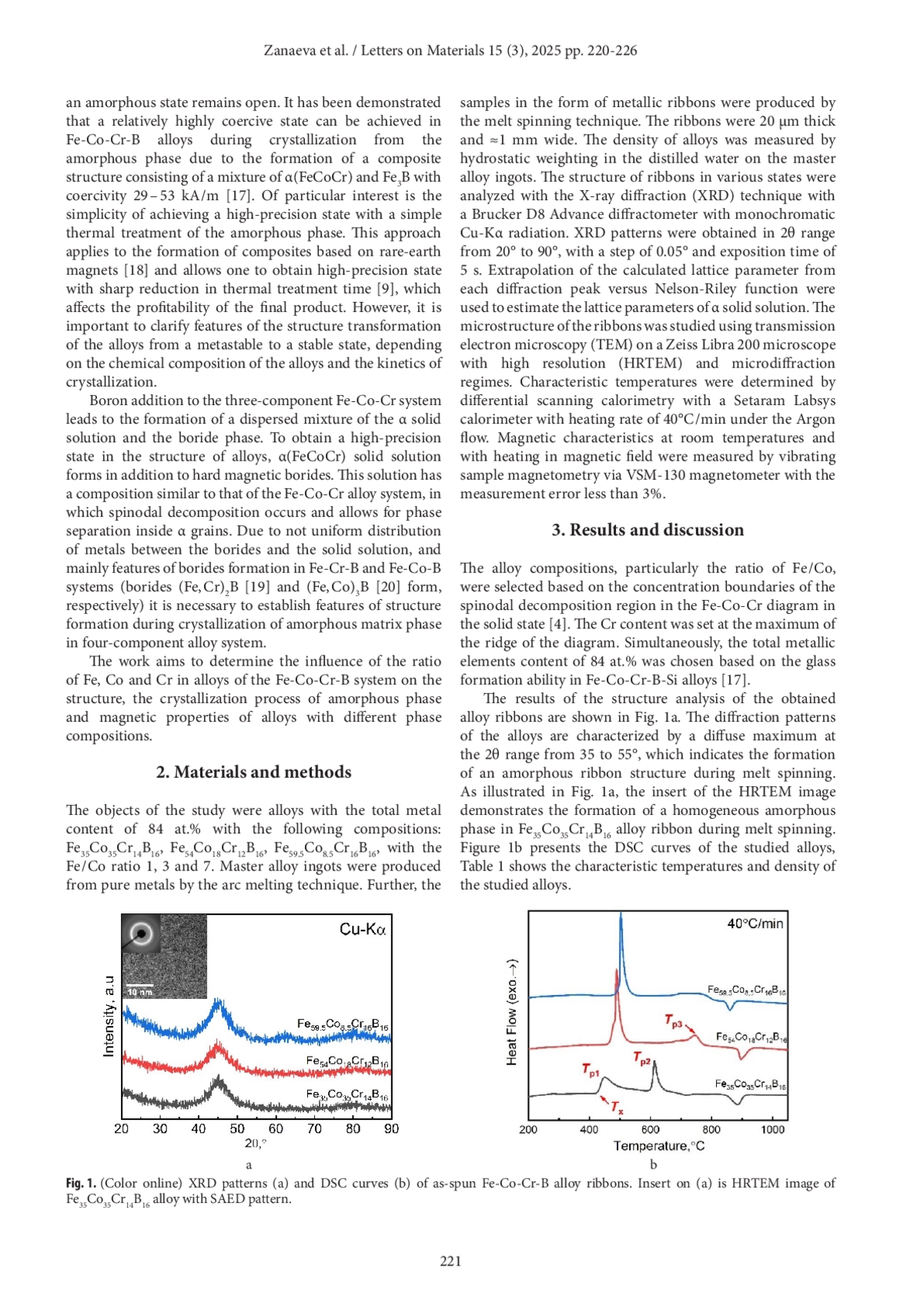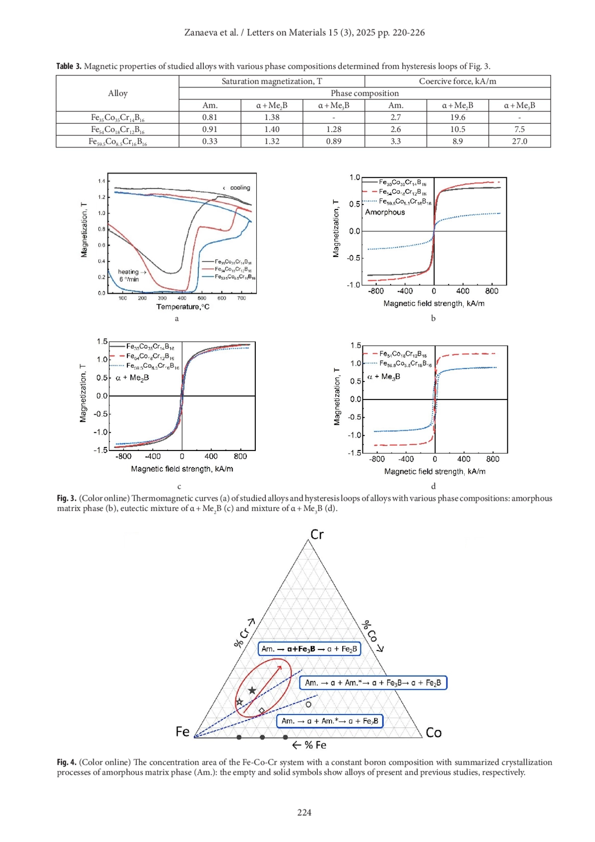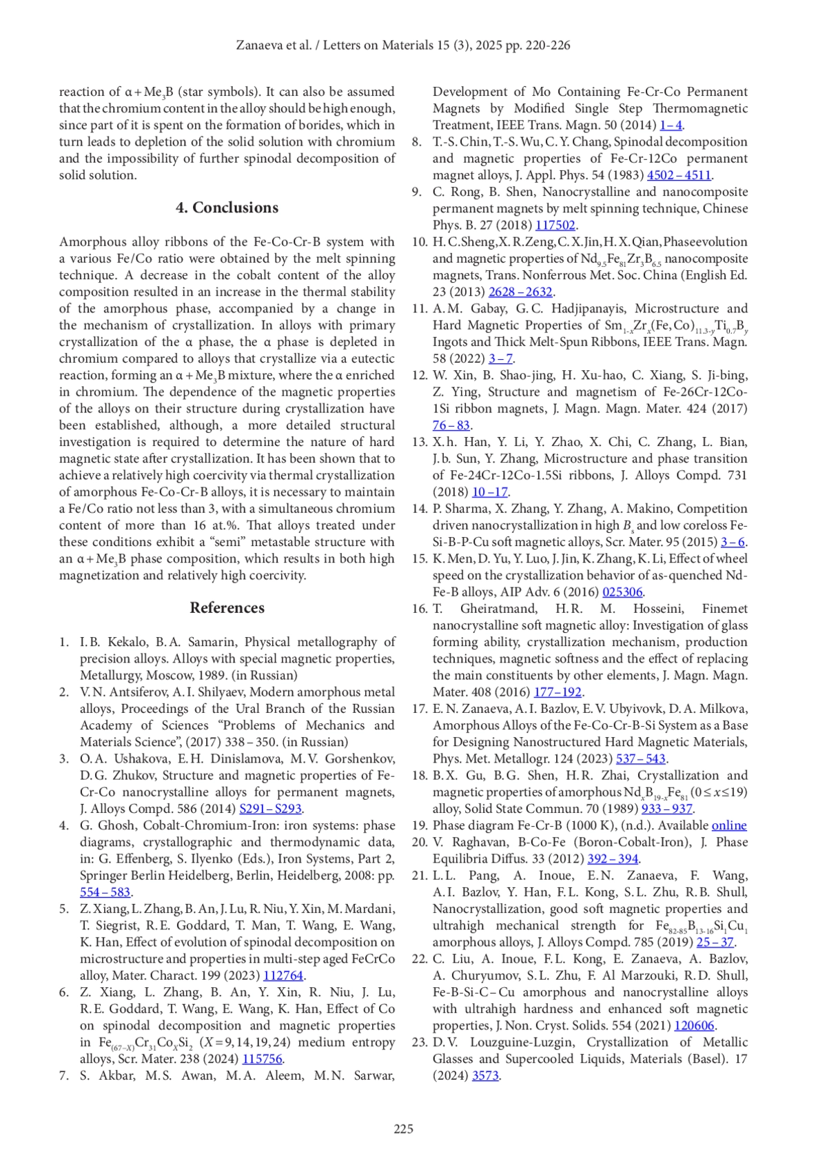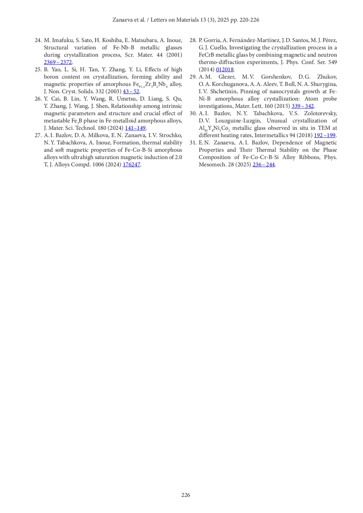 ЗАНАЕВА Э. Н., БАЗЛОВ А. И., КАЗАКОВА А. А. STRUCTURE AND MAGNETIC PROPERTIES OF AMORPHOUS ALLOYS OF THE FE-CO-CR-B SYSTEM WITH VARYING FE / CO RATIOS // ПИСЬМА О МАТЕРИАЛАХ. 2025. № 3 (59), ТОМ 15