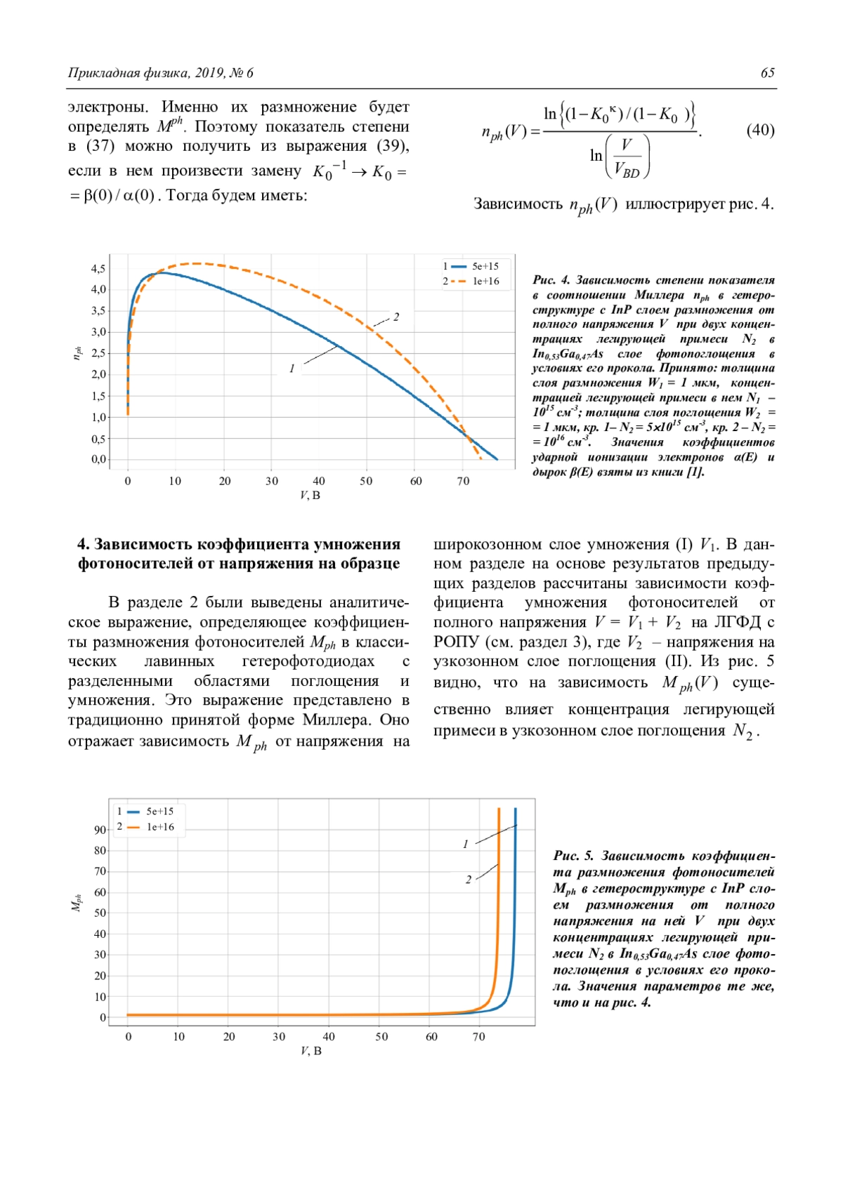 Значение Mph представлено в традиционно используемой форме Миллера (6). Аналитические зависимости Mph(V) весьма ценно иметь при физическом проектировании ЛГФД с РОПУ. Это обусловлено тем, что при определении оптимальных параметров структуры рассматриваемого прибора необходимо решать сопутствующую усилению фототока задачу – вычислять туннельные токи. Эти токи вызывают основной шум в образцах на основе прямозонных полупроводников, в которых происходит хорошее поглощение оптического излучения. Физическое проектирование ЛГФД с РОПУ на основе известных интегральных соотношений (1)–(5) очень трудоемко и сопряжено с большими вычислительными трудностями.