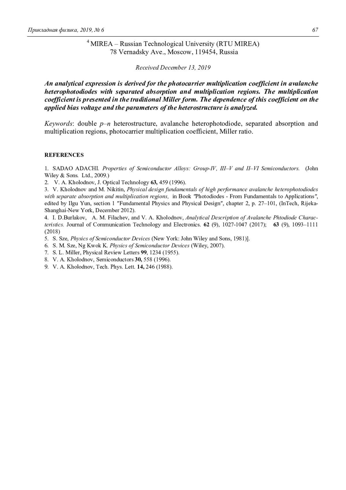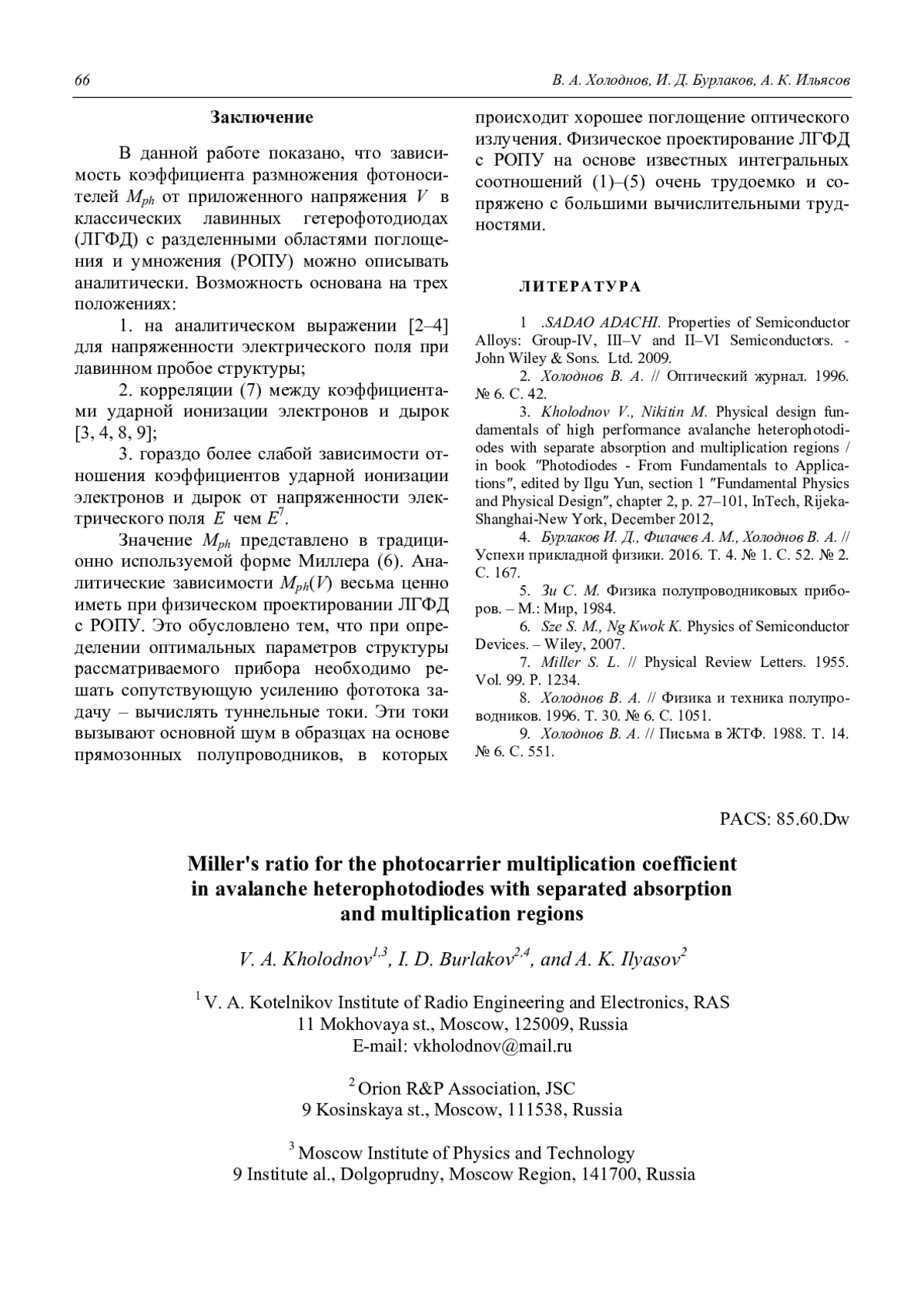 V. A. Kholodnov, I. D. Burlakov, and A. K. Ilyasov Miller’s ratio for the photocarrier multiplication coefficient in avalanche heterophotodiodes with separated absorption and multiplication regions 60