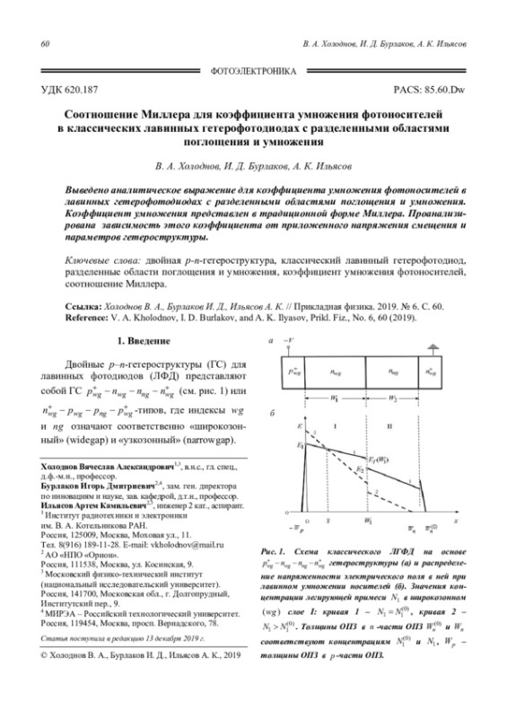 Холоднов В. А., Бурлаков И. Д., Ильясов А. К. Соотношение Миллера для коэффициента умножения фотоносителей в классических лавинных гетерофотодиодах с разделенными областями поглощения и умножения 60