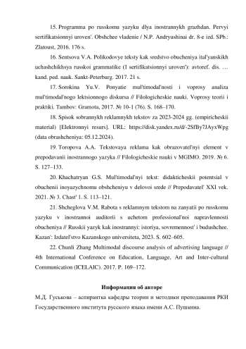 16. Сенцова В.А. Поликодовые тексты как средство обучения итальянских учащихся русской грамматике (I сертификационный уровень): автореф. дис. … канд. пед. наук. Санкт-Петербург, 2017. 21 с. EDN: YXFVOQ
