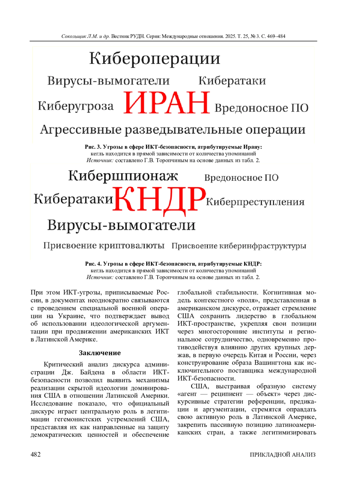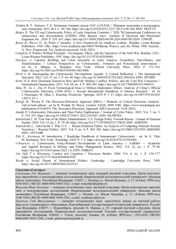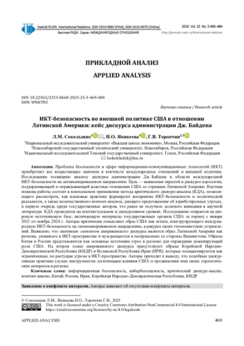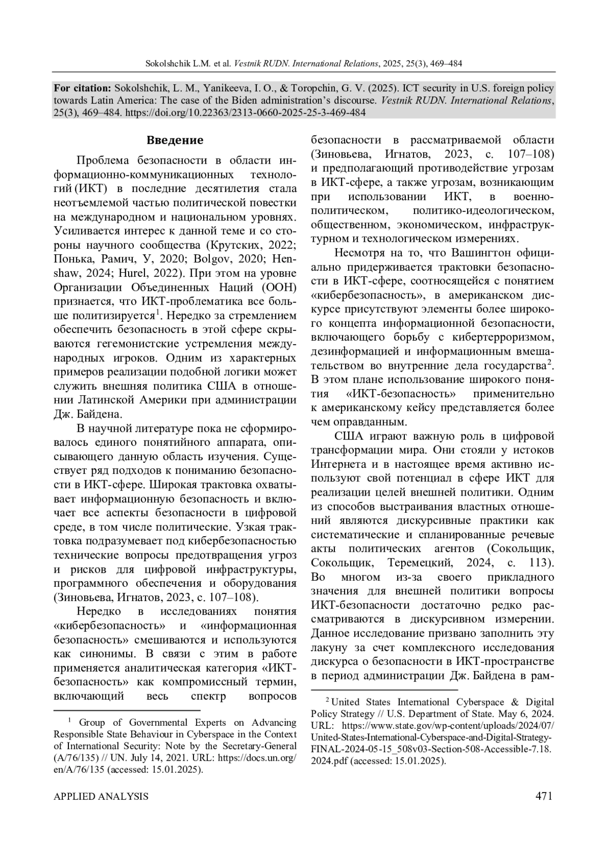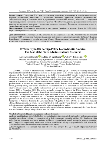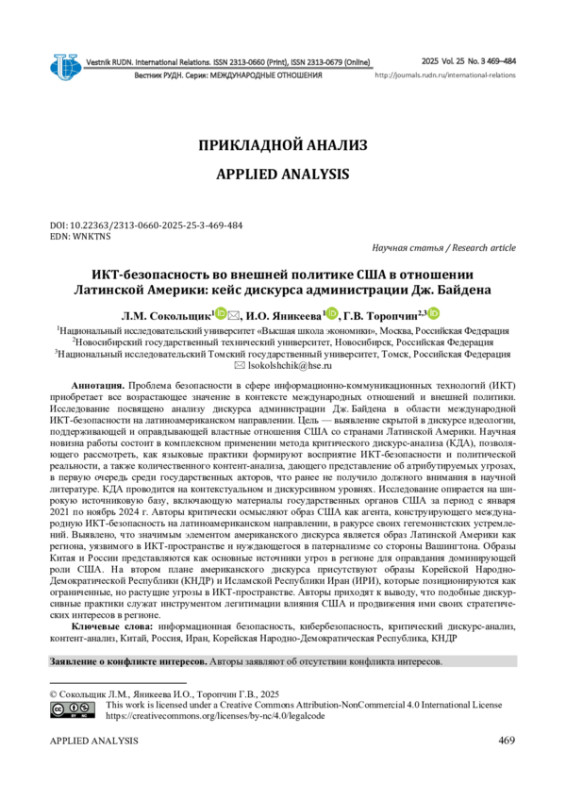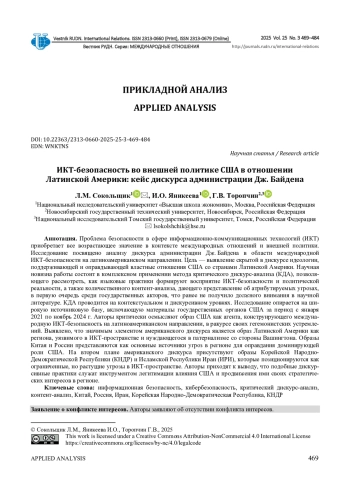 Проблема безопасности в сфере информационно-коммуникационных технологий (ИКТ) приобретает все возрастающее значение в контексте международных отношений и внешней политики. Исследование посвящено анализу дискурса администрации Дж. Байдена в области международной ИКТ-безопасности на латиноамериканском направлении. Цель - выявление скрытой в дискурсе идеологии, поддерживающей и оправдывающей властные отношения США со странами Латинской Америки. Научная новизна работы состоит в комплексном применении метода критического дискурс-анализа (КДА), позволяющего рассмотреть, как языковые практики формируют восприятие ИКТ-безопасности и политической реальности, а также количественного контент-анализа, дающего представление об атрибутируемых угрозах, в первую очередь среди государственных акторов, что ранее не получило должного внимания в научной литературе. КДА проводится на контекстуальном и дискурсивном уровнях. Исследование опирается на широкую источниковую базу, включающую материалы государственных органов США за период с января 2021 по ноябрь 2024 г. Авторы критически осмысляют образ США как агента, конструирующего международную ИКТ-безопасность на латиноамериканском направлении, в ракурсе своих гегемонистских устремлений. Выявлено, что значимым элементом американского дискурса является образ Латинской Америки как региона, уязвимого в ИКТ-пространстве и нуждающегося в патернализме со стороны Вашингтона. Образы Китая и России представляются как основные источники угроз в регионе для оправдания доминирующей роли США. На втором плане американского дискурса присутствуют образы Корейской Народно-Демократической Республики (КНДР) и Исламской Республики Иран (ИРИ), которые позиционируются как ограниченные, но растущие угрозы в ИКТ-пространстве. Авторы приходят к выводу, что подобные дискурсивные практики служат инструментом легитимации влияния США и продвижения ими своих стратегических интересов в регионе.